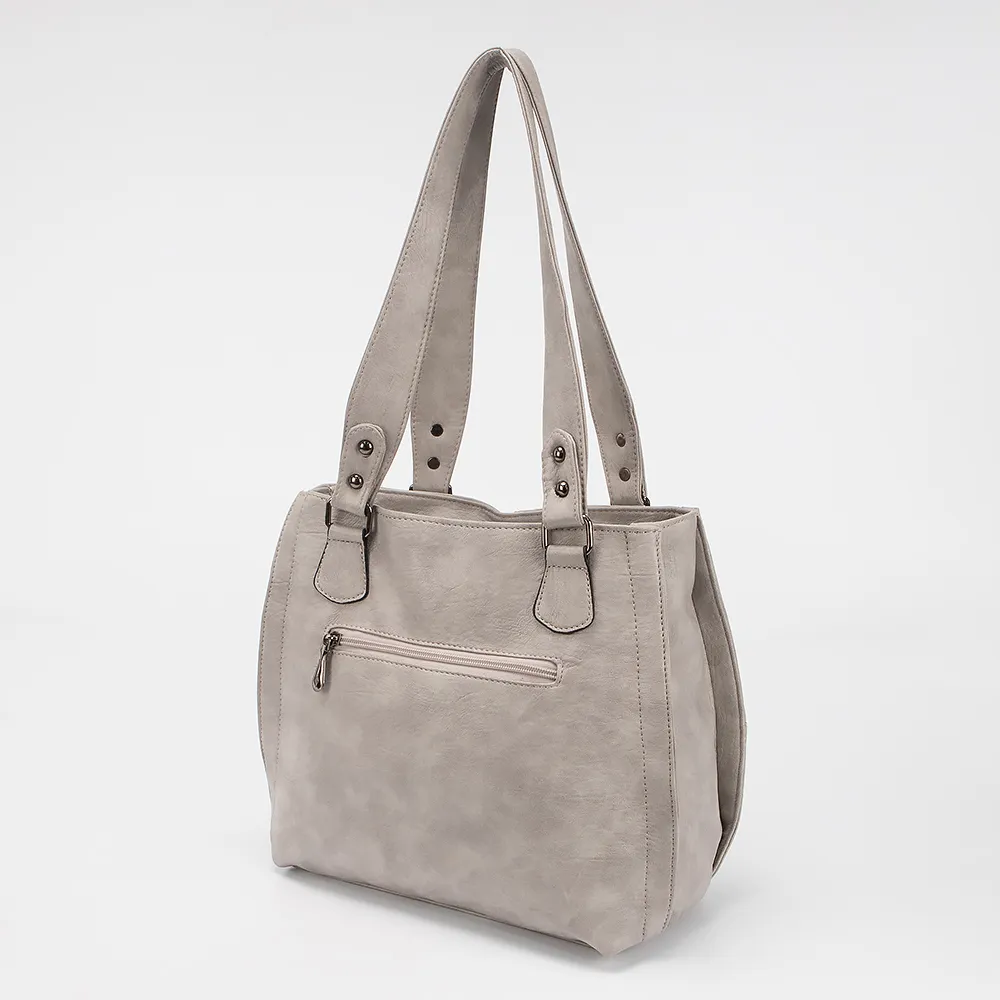 Сумка от торговой марки Passo Avanti из искусственной кожи бежевого цвета. Модель с двумя удлиненными ручками. Два отделения на молнии, с текстильной подкладкой. В заднем отделении - карман на молнии, в переднем - два накладных кармана. На задней стороне - карман на молнии. Лицевая сторона декорирована вставками и отстрочкой.
