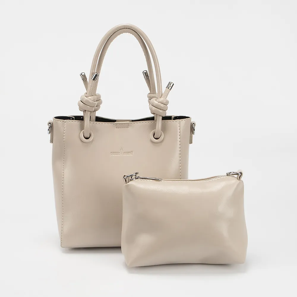 Набор Сумок от торговой марки Passo Avanti из искусственной кожи серого цвета. Вместительная модель с двумя ручками с креплением на люверсы и затянутыми в узел, и съемным регулируемым плечевым ремнем. Отделение на магнитной кнопке, без подкладки. Дно оснащено металлическими ножками для защиты от износа. Миниатюрная модель с отделением на молнии и съемным регулируемым плечевым ремнем.