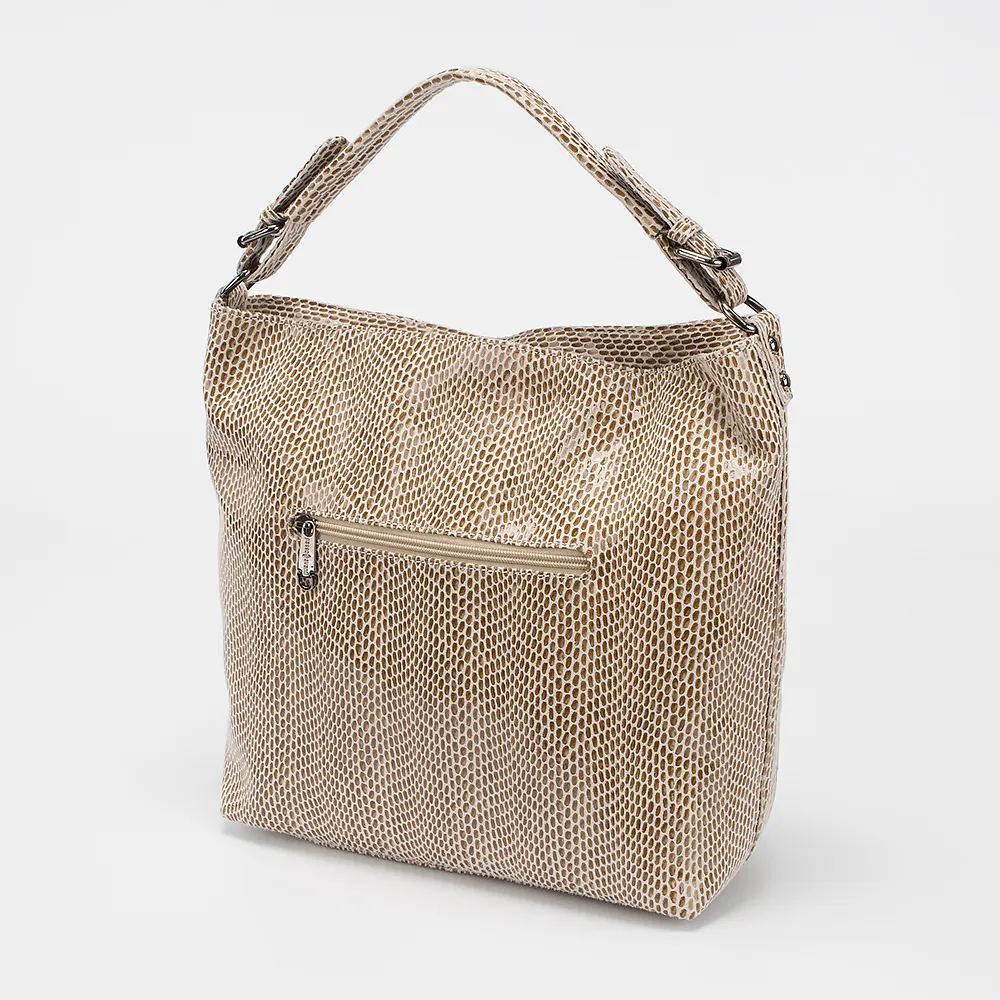Сумка от торговой марки Passo Avanti из искусственной кожи бежевого цвета с лазерным тиснением под камни. Вместительная модель с длинной ручкой. Отделение на молнии. Внутри: фирменная текстильная подкладка, карман на молнии, образующий накладной карман, два накладных кармана. На задней стороне - карман на молнии. Дно оснащено металлическими ножками для защиты от износа.