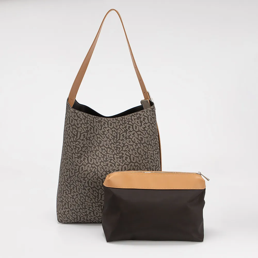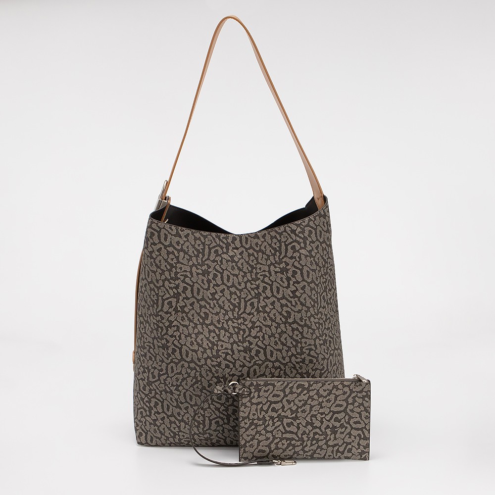 Сумка от торговой марки Marzia из искусственной кожи кофейного цвета с принтом под леопарда. Модель с длинной регулируемой ручкой. Отделение закрывается карабином, без подкладки. Дно оснащено металлическими ножками для защиты от износа. В комплект входит кошелек на молнии.