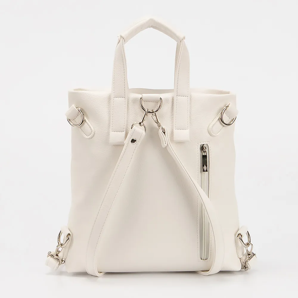 Сумка-рюкзак от торговой марки Passo Avanti из искусственной кожи белого цвета. Модель с двумя короткими ручками, и плечевыми лямками, которые трансформируются в плечевой ремень. Отделение на молнии. Внутри: текстильная подкладка, карман на молнии, накладной карман. На лицевой стороне - два кармана на молнии и карман с клапаном на магнитной кнопке. На задней стороне - вертикальный карман на молнии.