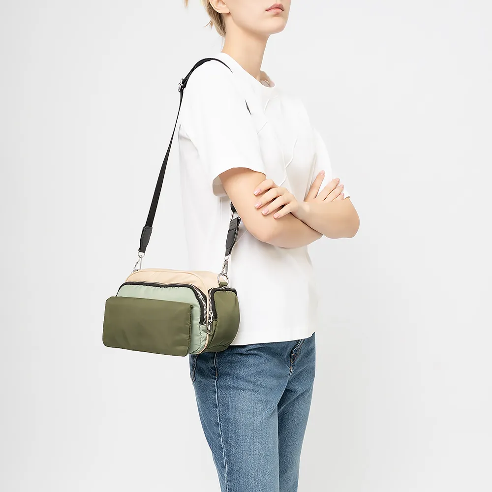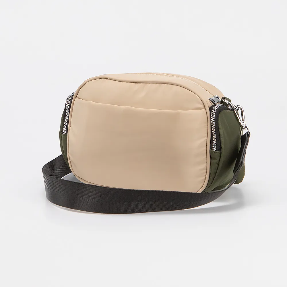 Сумка от торговой марки Ecotope из текстильного материала бежевого цвета с контрастными карманами. Модель с длинным регулируемым плечевым ремнем. Отделение на молнии. Внутри: текстильная подкладка, карман на молнии, накладной карман. С лицевой стороны два объемных кармана. По бокам - карманы на молнии. С задней стороны - дополнительный карман.