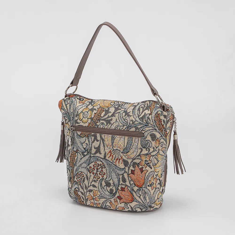 Сумка от торговой марки Passo Avanti из текстильного материала с элементами искусственной кожи с изображением цветов. Модель с длинной ручкой и съемным плечевым ремнем. Декорирована подвесками-кисточками. Отделение на молнии. Внутри: текстильная подкладка, карман и средник на молнии, накладной карман. На задней стороне - карман на молнии.