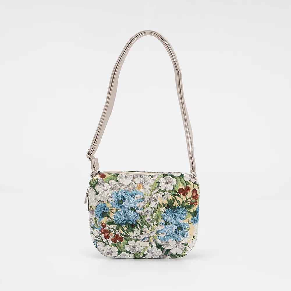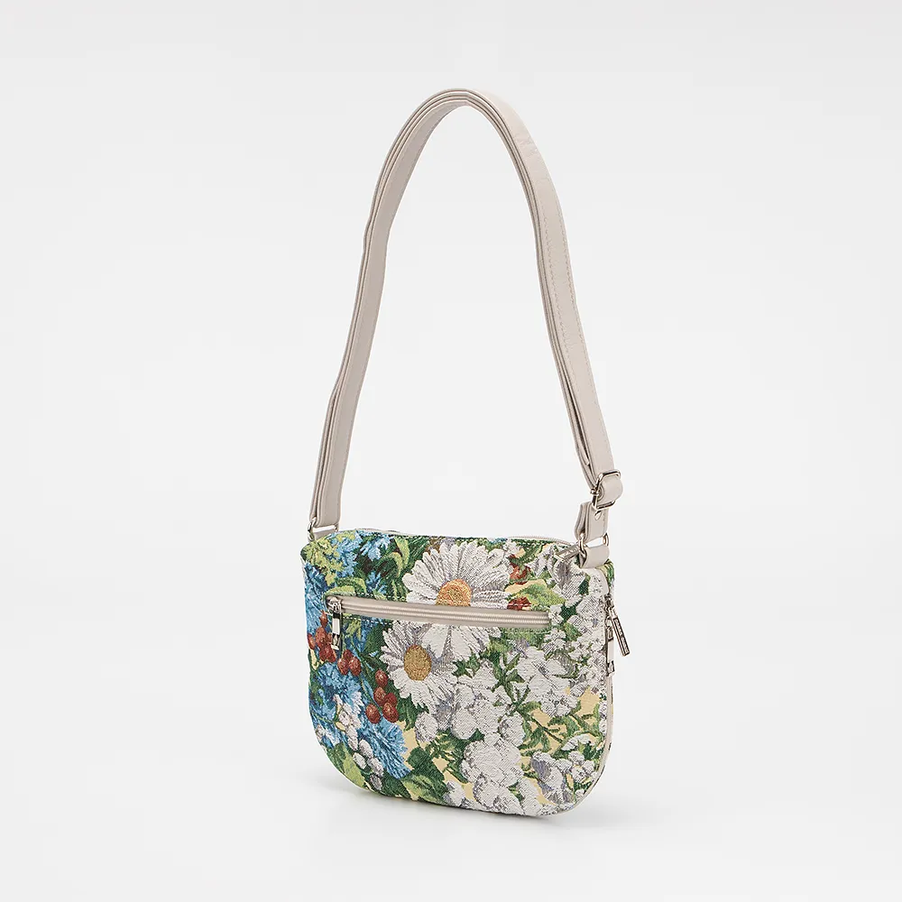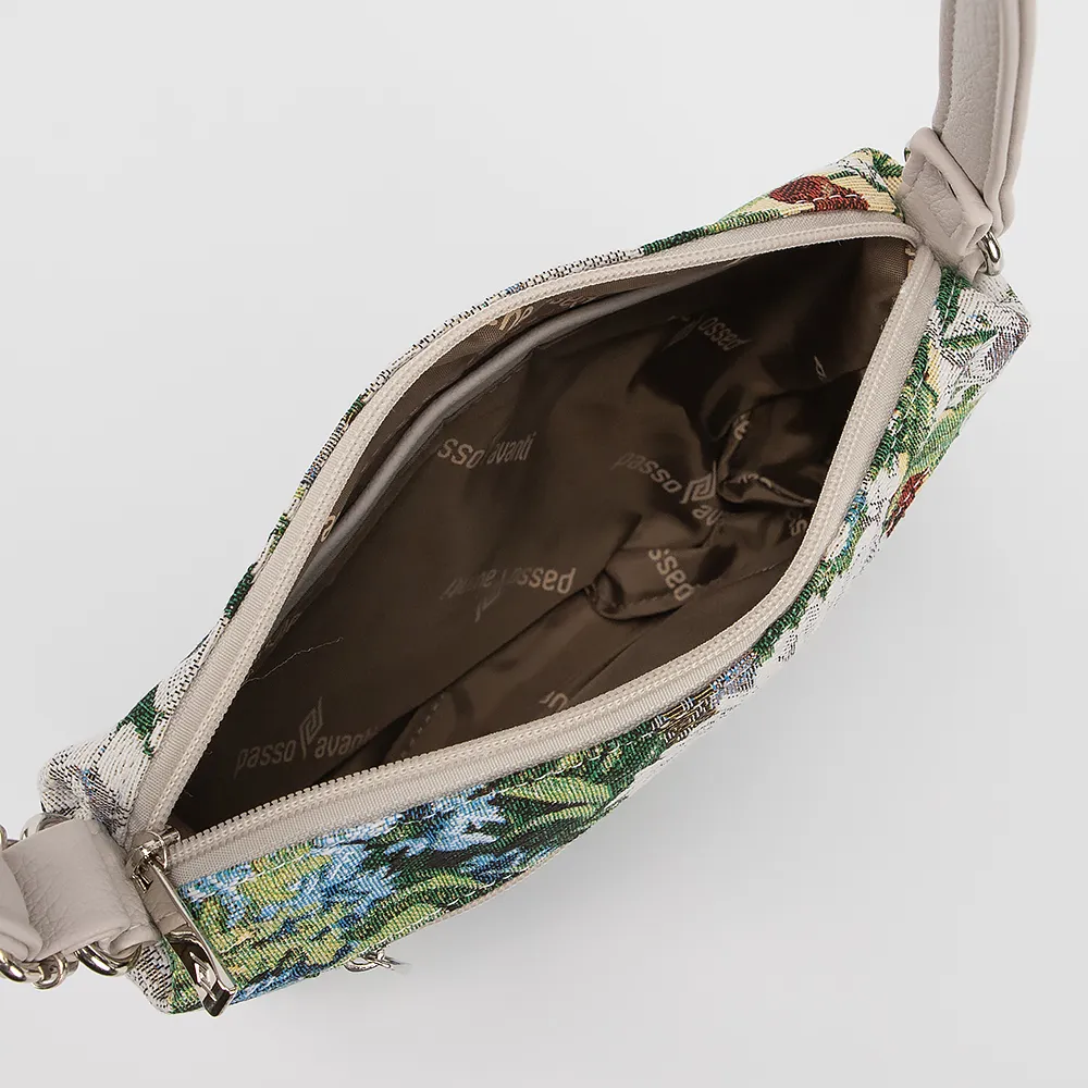 Сумка от торговой марки Passo Avanti из текстильного материала с цветочным принтом. Плоская модель с несъемным регулируемым плечевым ремнем. Отделение на молнии. Внутри: текстильная подкладка, накладной карман, карман на молнии. На задней стороне - карман на молнии.