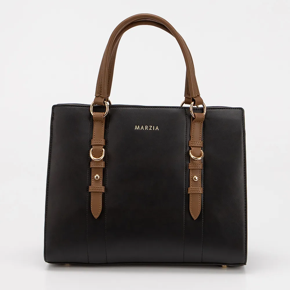 Сумка от торговой марки Marzia выполнена из искусственной кожи черного цвета. Модель с двумя ручками и съемным регулируемым плечевым ремнем. Отделение на молнии. Внутри: текстильная подкладка, средник без застежки, карман на молнии, накладной карман. Дно оснащено металлическими ножками для защиты от износа.
