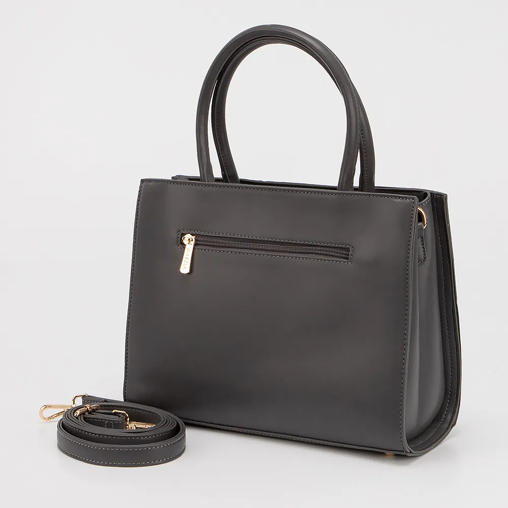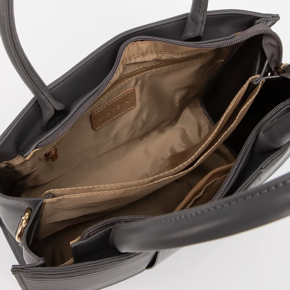 Сумка от торговой марки Marzia выполнена из искусственной кожи серого цвета. Модель с двумя ручками и съемным регулируемым плечевым ремнем. Декорирована объемным плетением. Отделение на молнии. Внутри: текстильная подкладка, средник без застежки, карман на молнии, накладной карман. На задней стороне - карман на молнии. Дно оснащено металлическими ножками для защиты от износа.
