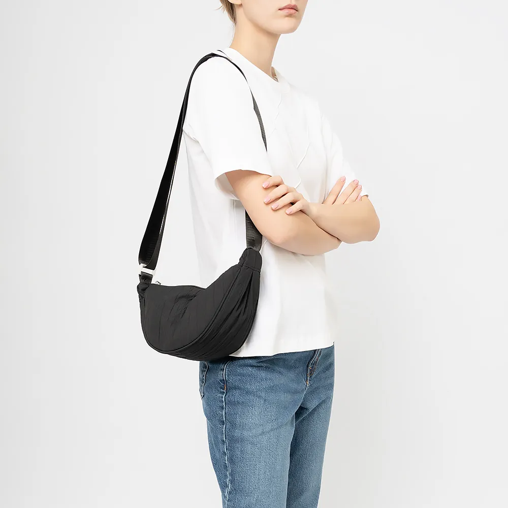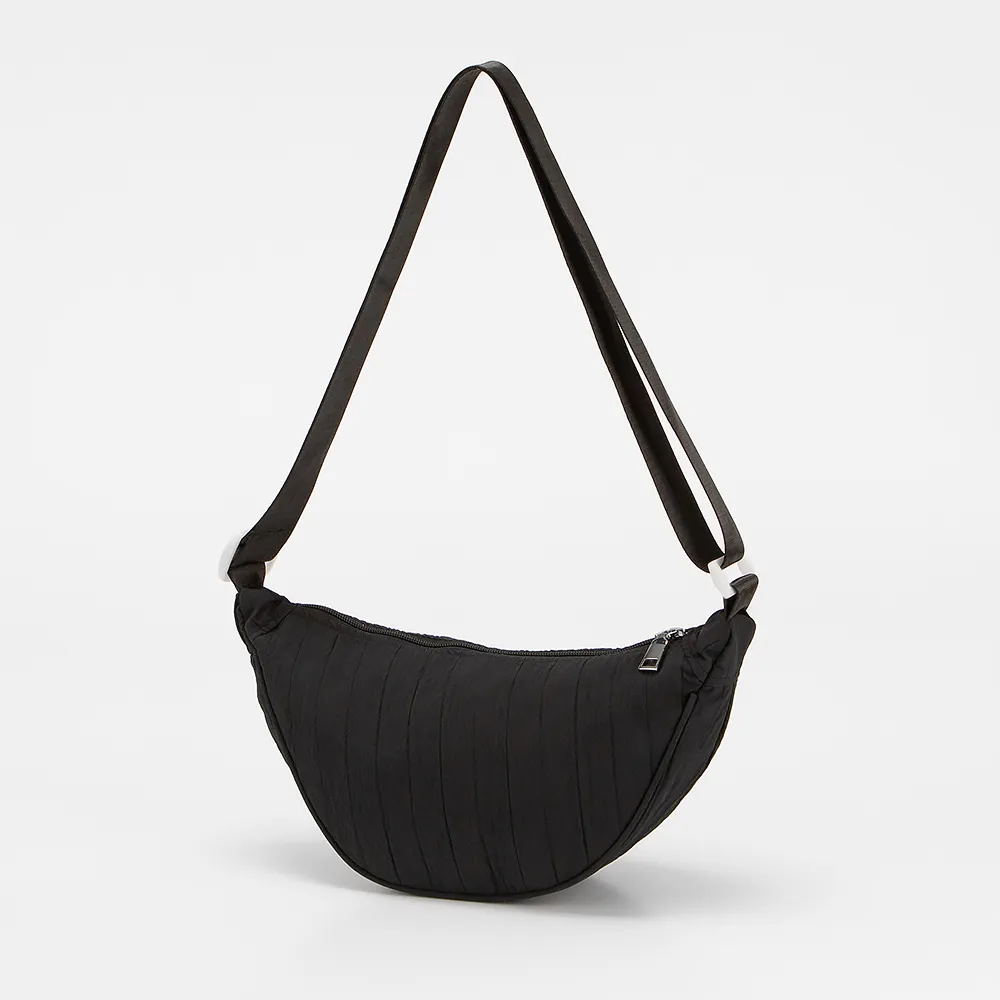 Сумка от торговой марки Ecotope из текстильного материала черного цвета. Модель в форме полумесяца с длинным широким регулируемым плечевым ремнем. Отделение на молнии. Внутри: текстильная подкладка.