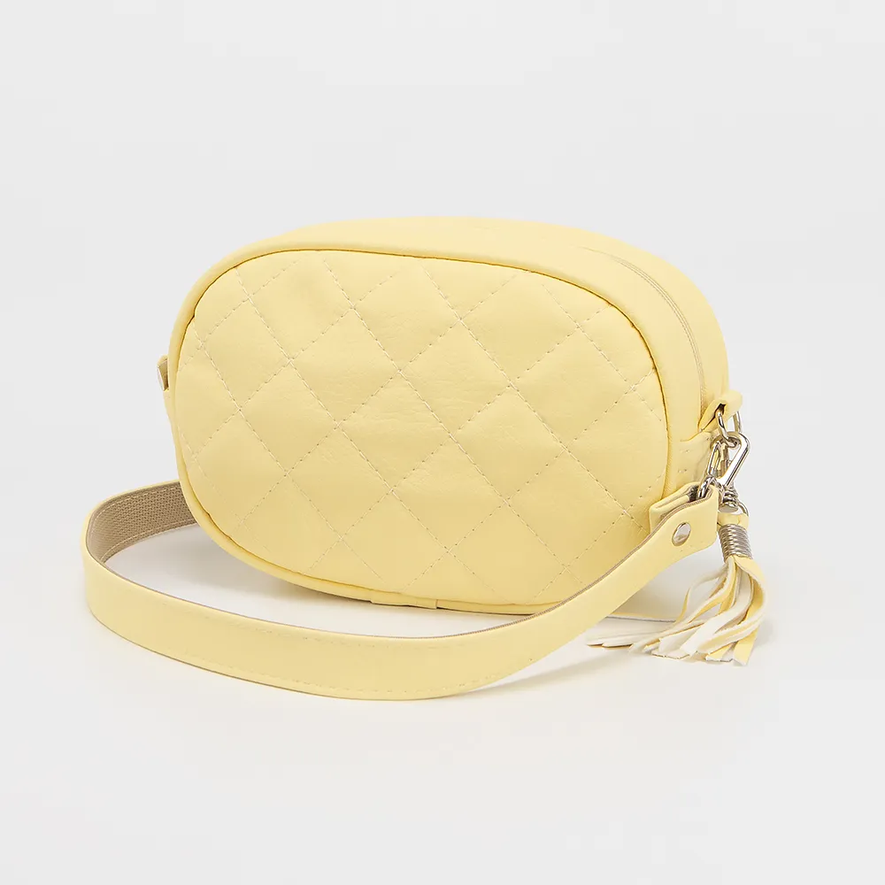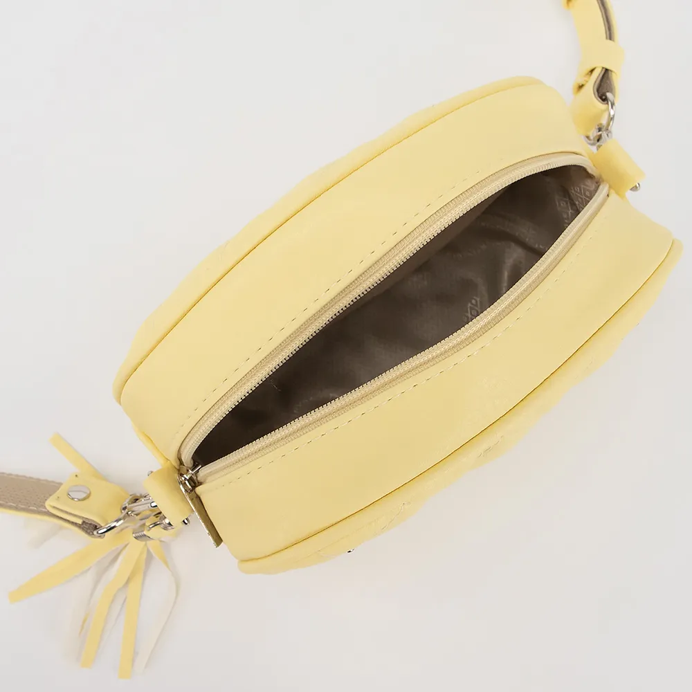 Сумка от торговой марки Passo Avanti из искусственной кожи желтого цвета с ромбовидной стежкой. Модель с длинным регулируемым плечевым ремнем. Декорирована металлическими бусинами и кисточкой из искусственной кожи. Отделение на молнии. Внутри: текстильная подкладка, накладной карман, карман на молнии.