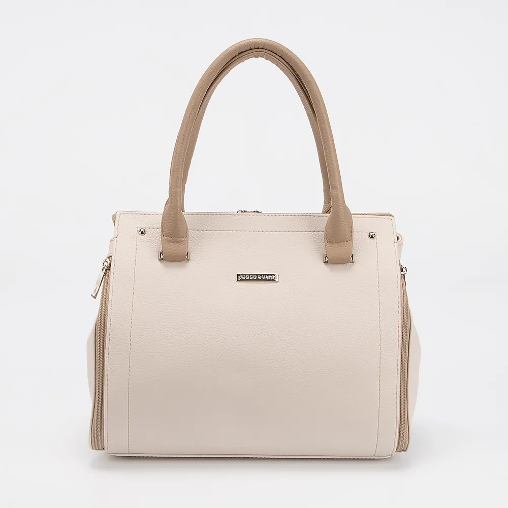 Сумка от торговой марки Passo Avanti выполнена из искусственной кожи бежевого цвета. Модель с двумя ручками и съемным регулируемым плечевым ремнем. Декорирована вертикальными молниями по бокам. Отделение на молнии. Внутри: текстильная подкладка, карман на молнии, накладной карман. На задней стороне - карман на молнии. Дно оснащено металлическими ножками для защиты от износа.