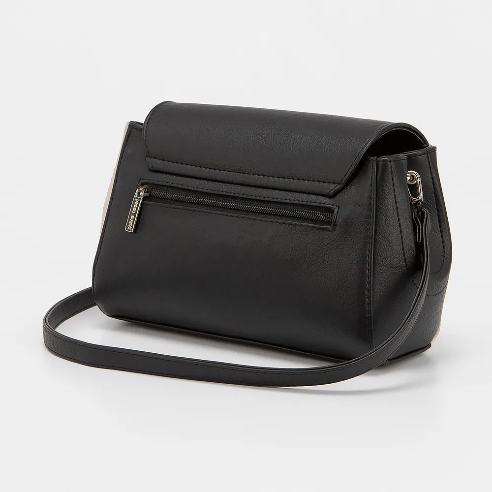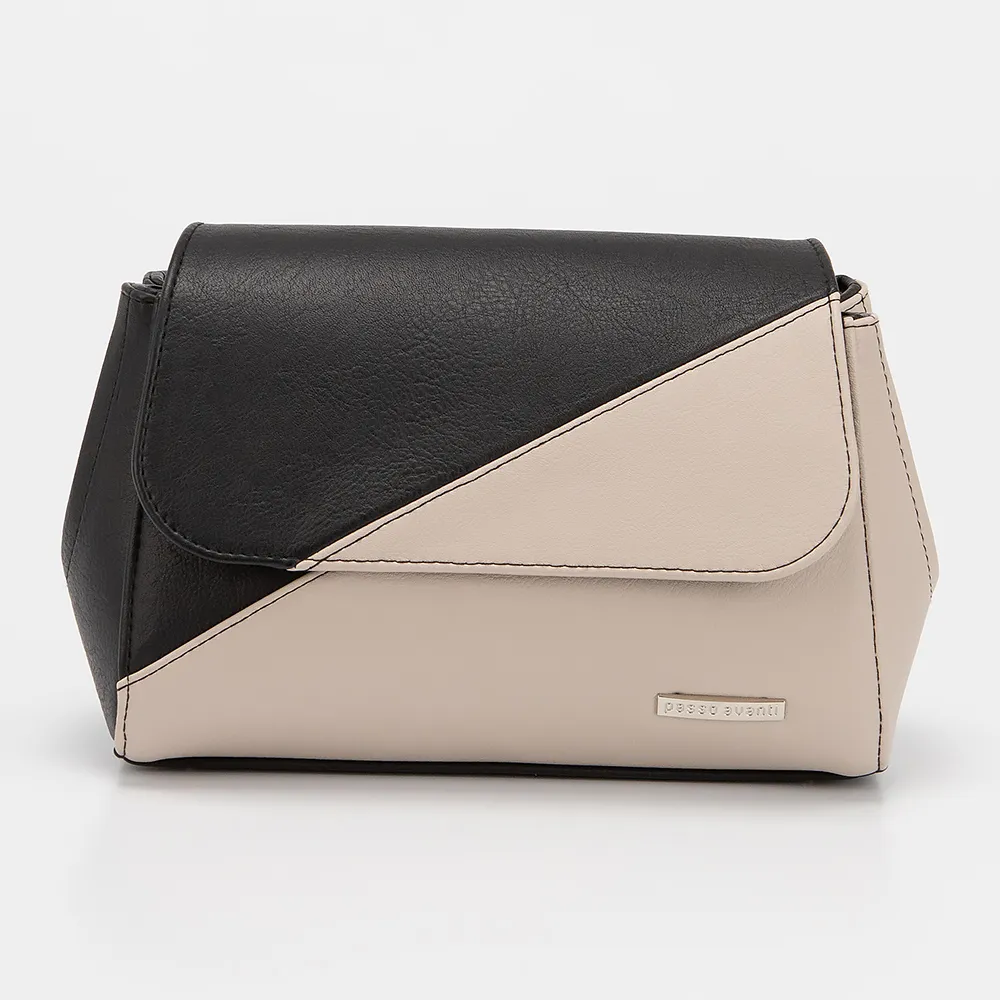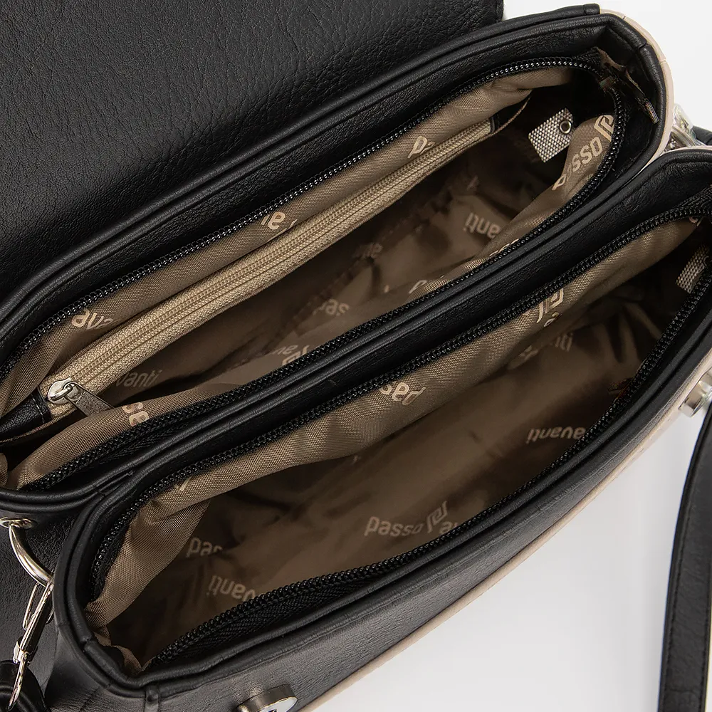 Сумка от торговой марки Passo Avanti выполнена из искусственной кожи в сочетании бежевого и черного цвета. Модель с регулируемым плечевым ремнем. Клапан закрывает два отделения на молнии. Внутри: текстильная подкладка, карман на молнии, накладной карман. На задней стороне - карман на молнии. Дно оснащено металлическими ножками для защиты от износа.