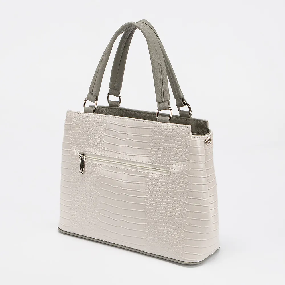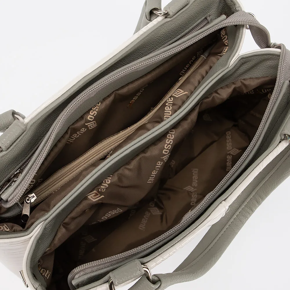 Сумка от торговой марки Passo Avanti выполнена из искусственной кожи серого цвета с тиснением под рептилию. Модель с двумя ручками. Отделение на молнии. Внутри: два отсека,текстильная подкладка, карман на молнии, накладной карман. На задней стороне - карман на молнии. Дно оснащено металлическими ножками для защиты от износа.