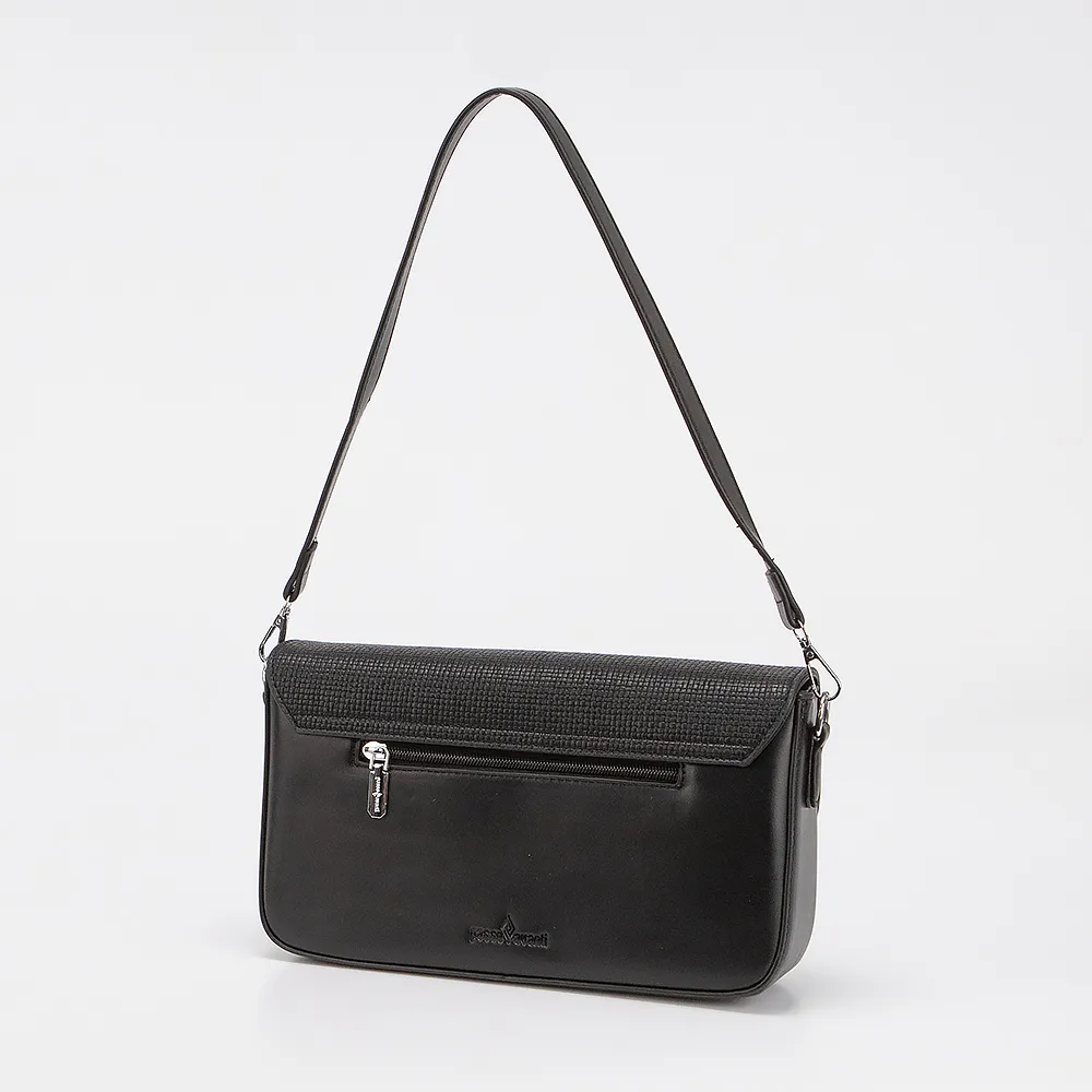 Сумка от торговой марки Passo Avanti выполнена из искусственной кожи черного цвета. Модель с длинной съемной ручкой и съемным регулируемым плечевым ремнем. Клапан на магнитной кнопке закрывает отделение на молнии. Внутри: текстильная подкладка, карман на молнии. С задней стороны - карман на молнии.