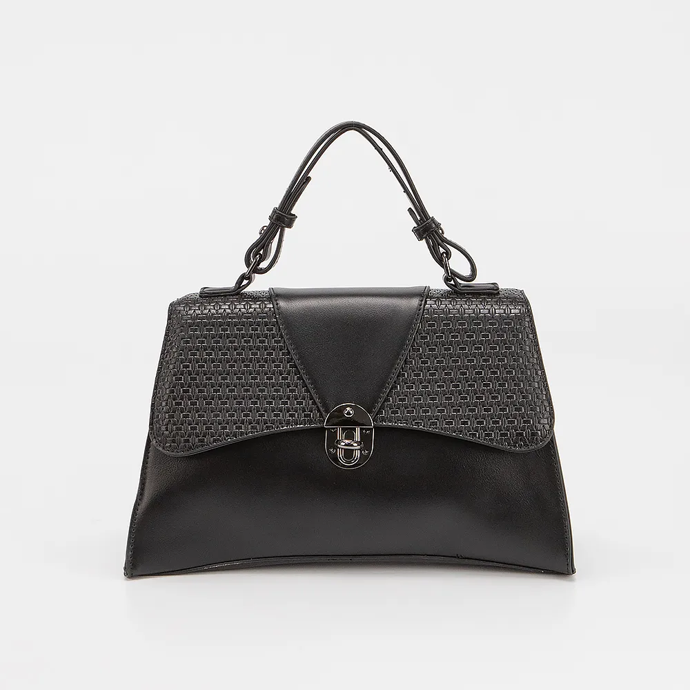 Сумка от торговой марки Marzia выполнена из искусственной кожи черного цвета и вставками с тиснением под плетение. Модель с ручкой и съемным регулируемым плечевым ремнем. Клапан на поворотном замке закрывает отделение на молнии. Внутри: текстильная подкладка, карман и средник на молнии, накладной карман.