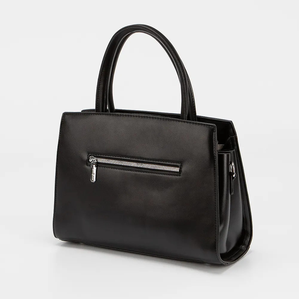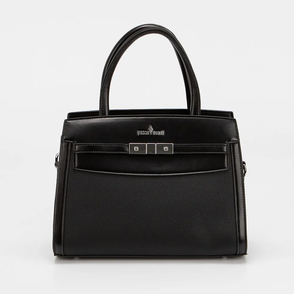 Сумка от торговой марки Passo Avanti выполнена из искусственной кожи черного цвета. Модель с двумя ручками и съемным регулируемым плечевым ремнем. Декорирована тонкими ремешками. Отделение на молнии. Внутри: текстильная подкладка, плотный средник, карман на молнии, накладной карман. На задней стороне - карман на молнии. Дно оснащено металлическими ножками для защиты от износа.