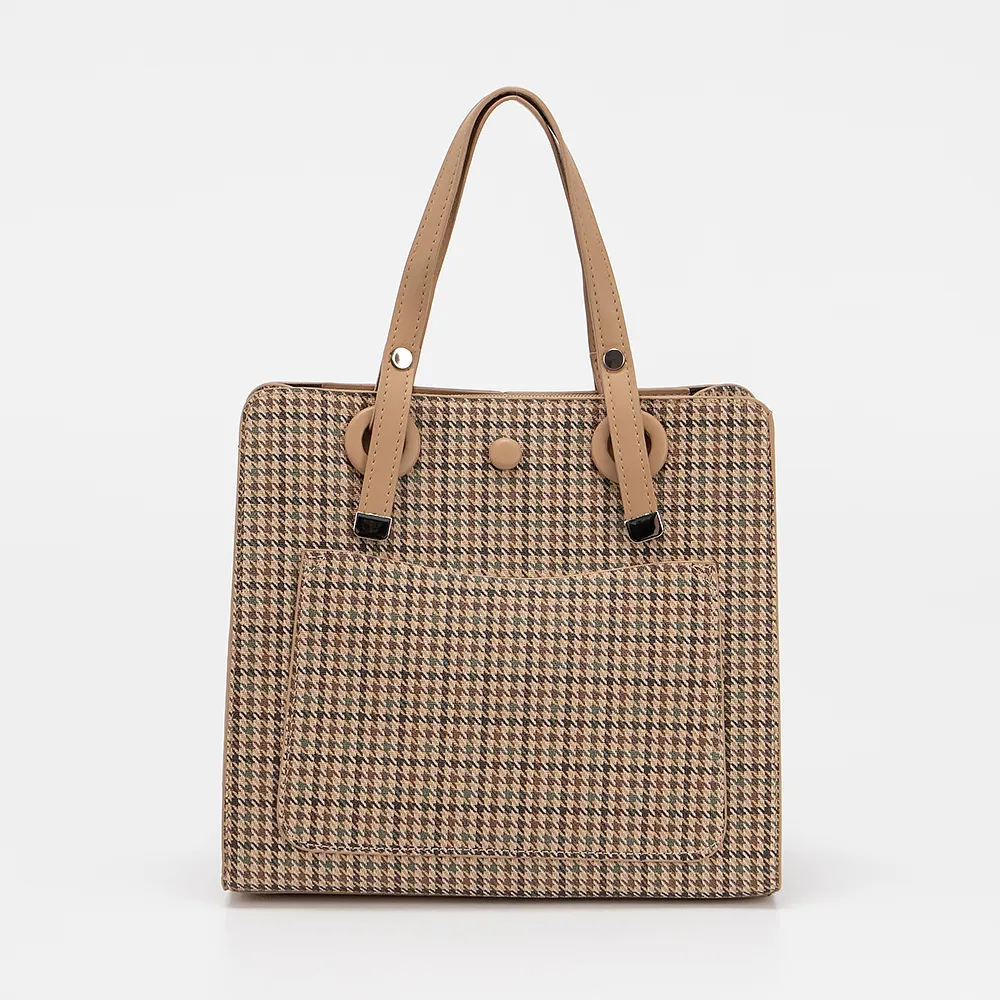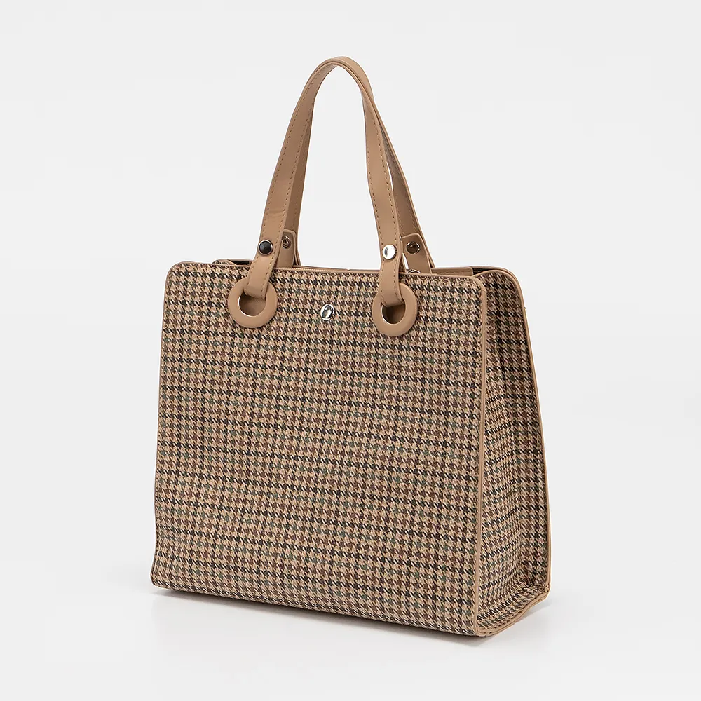 Сумка от торговой марки Passo Avanti из искусственной кожи кофейного цвета с принтом гусиная лапка. Модель с двумя ручками и съемными регулируемым плечевым ремнем. Модель с тремя отделениями. Среднее отделение на молнии. Внутри текстильная подкладка, карман на молнии, накладной карман. Отделения по бокам на магнитной кнопке. Дно оснащено металлическими ножками для защиты от износа.