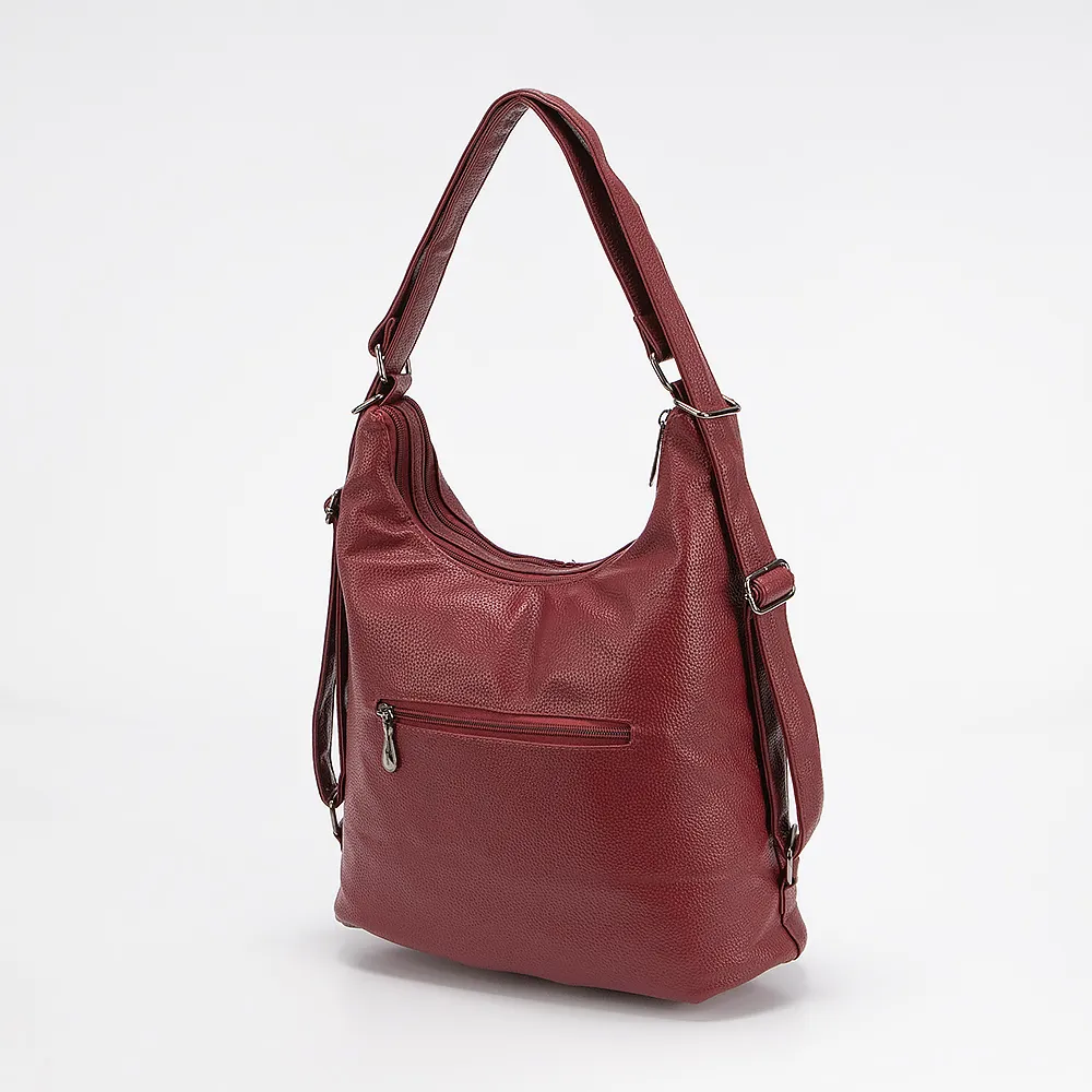 Сумка-рюкзак от торговой марки Passo Avanti из искусственной кожи бордового цвета. Модель с двумя ручками, которые стягиваются в плечевые лямки. Два отделения на молнии. Внутри: текстильная подкладка, карман на молнии, накладной карман. На лицевой стороне - три кармана на молнии. На задней стороне - карман на молнии.