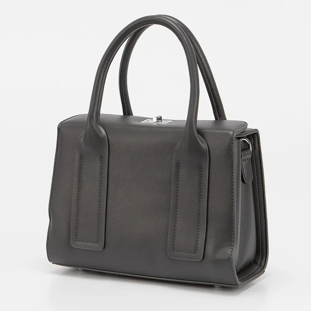 Сумка от торговой марки Passo Avanti из искусственной кожи серого цвета. Модель с двумя ручками и съемным регулируемым плечевым ремнем. Отделение на поворотном замке. Внутри: два отсека, текстильная подкладка, карман на молнии, накладной карман. Дно оснащено металлическими ножками для защиты от износа.