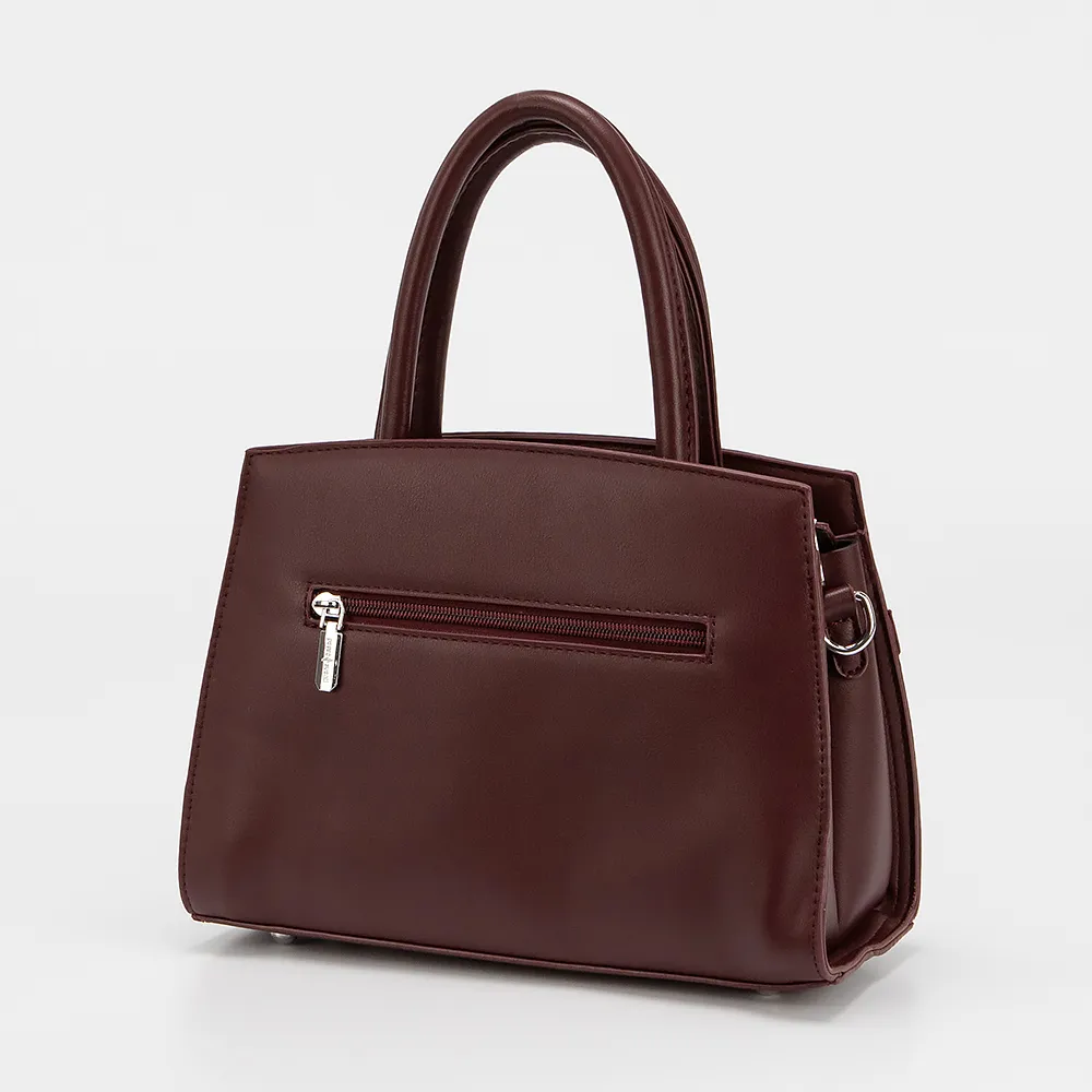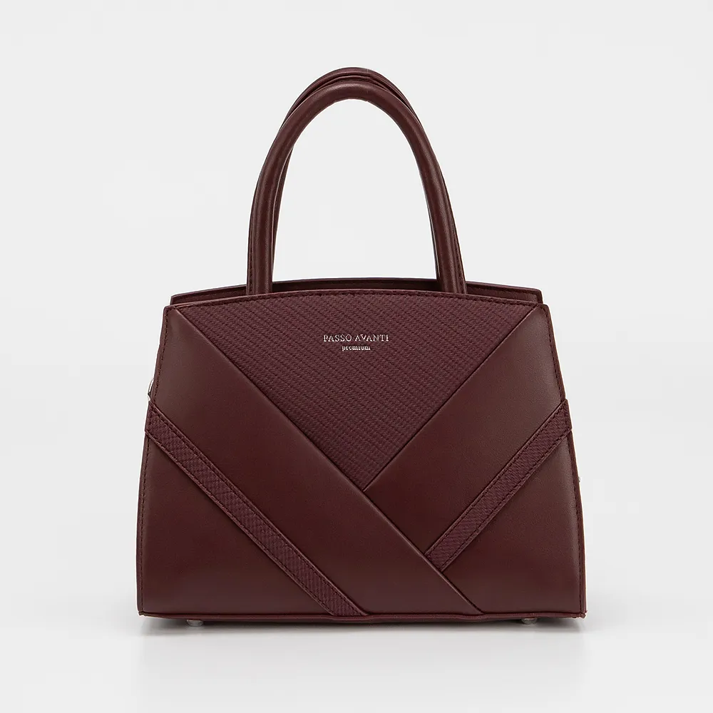 Сумка от торговой марки Passo Avanti из искусственной кожи бордового цвета. Модель с двумя ручками и съемным регулируемым плечевым ремнем. Отделение на молнии. Внутри: два отсека, текстильная подкладка, карман на молнии, накладной карман. С задней стороны - карман на молнии. Дно оснащено металлическими ножками для защиты от износа.