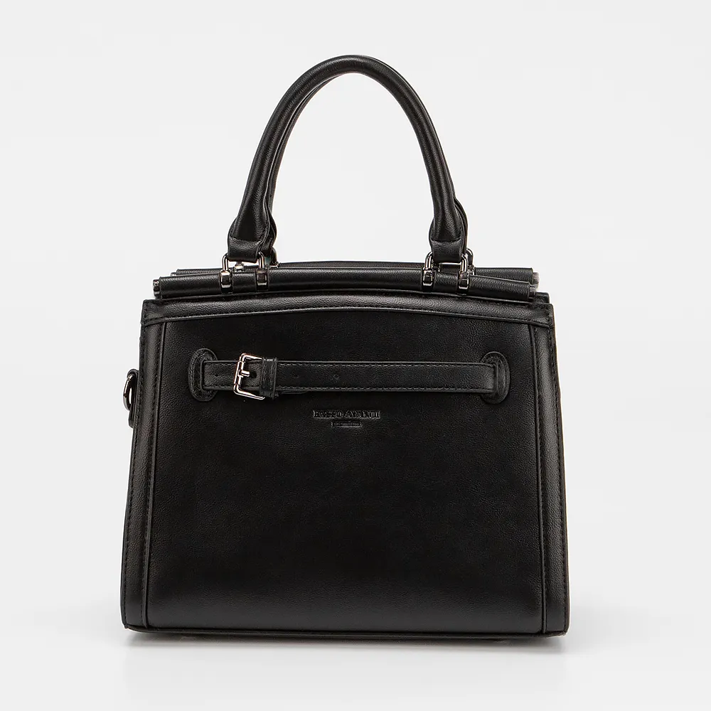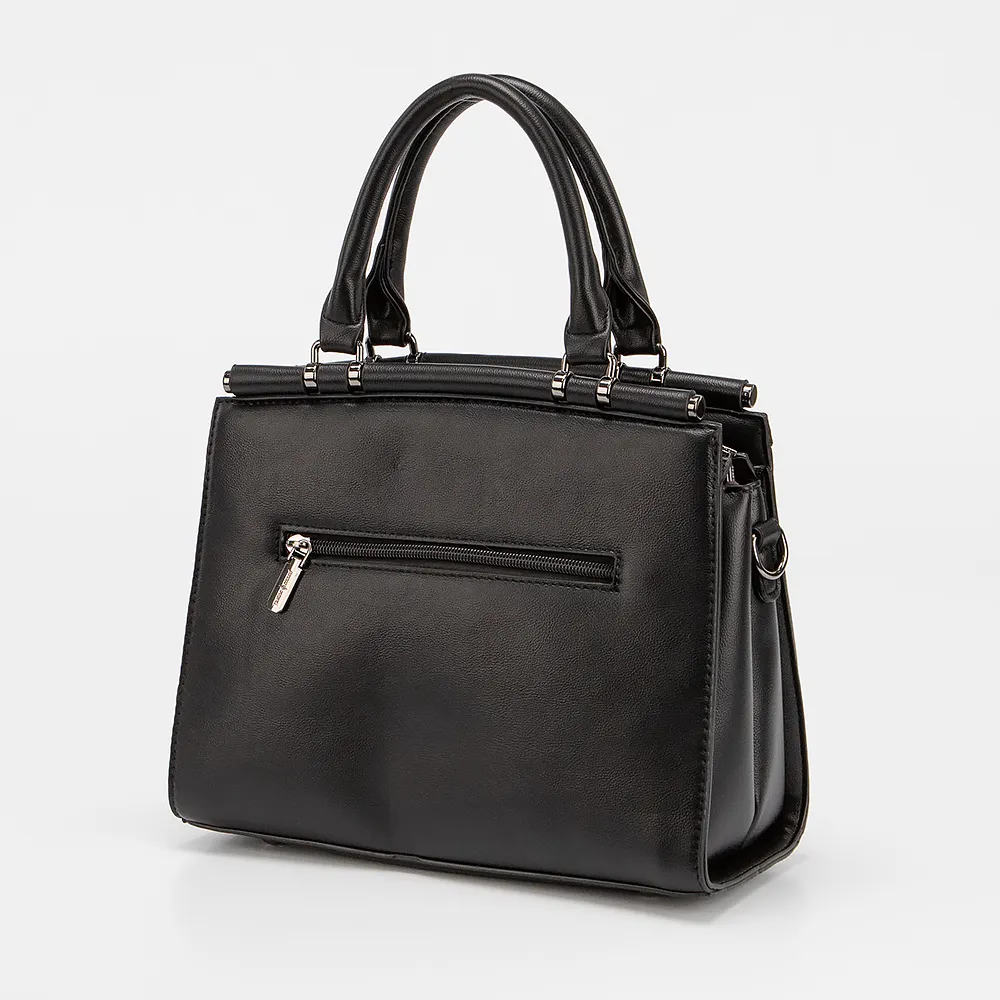 Сумка от торговой марки Passo Avanti из искусственной кожи черного цвета. Модель с двумя ручками и съемным регулируемым плечевым ремнем. Декорирована тонким ремешком. Отделение на молнии. Внутри: текстильная подкладка, карман и средник на молнии, накладной карман. С задней стороны - карман на молнии. Дно оснащено металлическими ножками для защиты от износа.