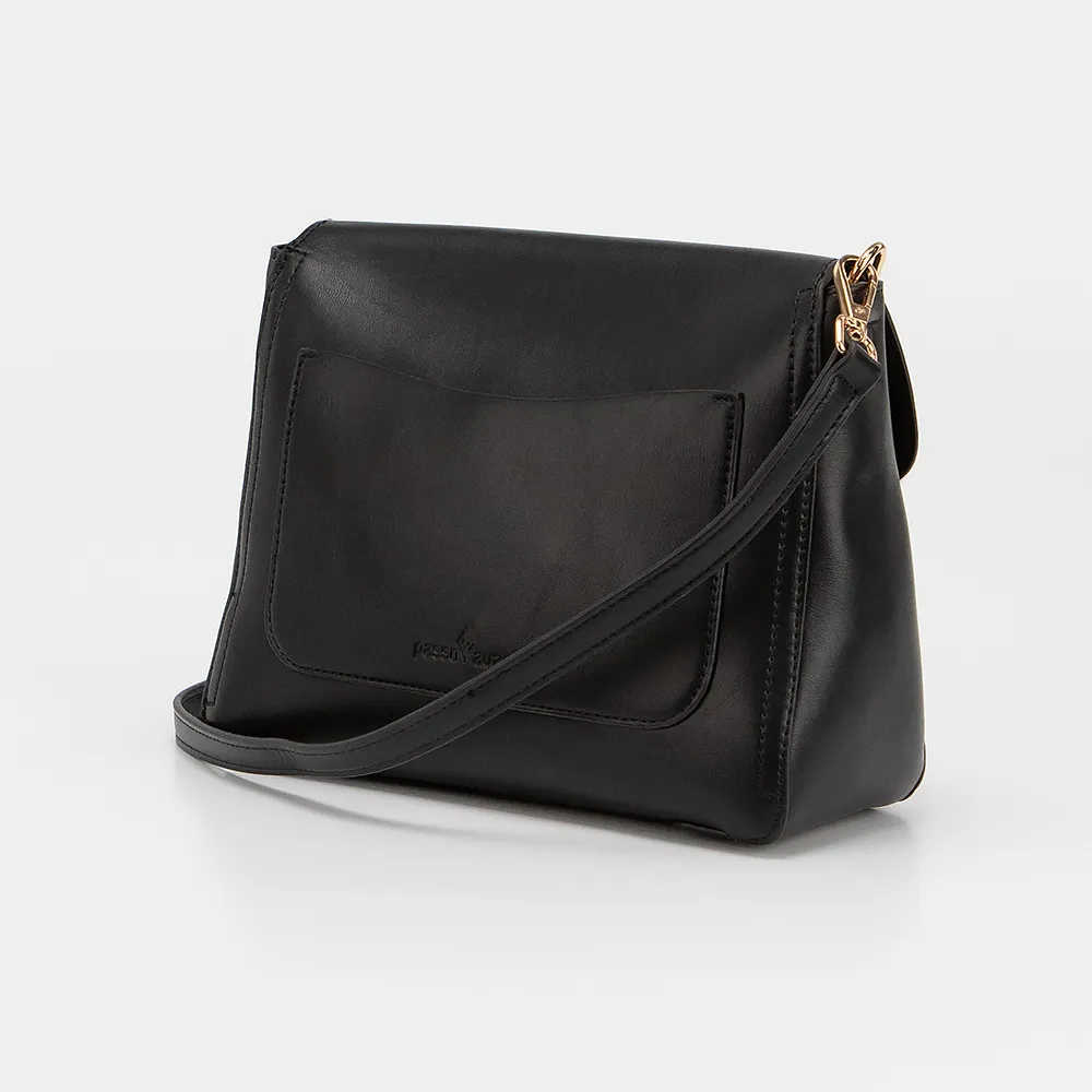 Сумка от торговой марки Passo Avanti выполнена из искусственной кожи черного цвета. Модель с длинным регулируемым плечевым ремнем. Клапан на поворотном замке закрывает основное отделение, в котором располагается сумка-вкладыш на молнии, которую можно отдельно использовать с плечевым ремнем. На задней стороне - накладной карман.