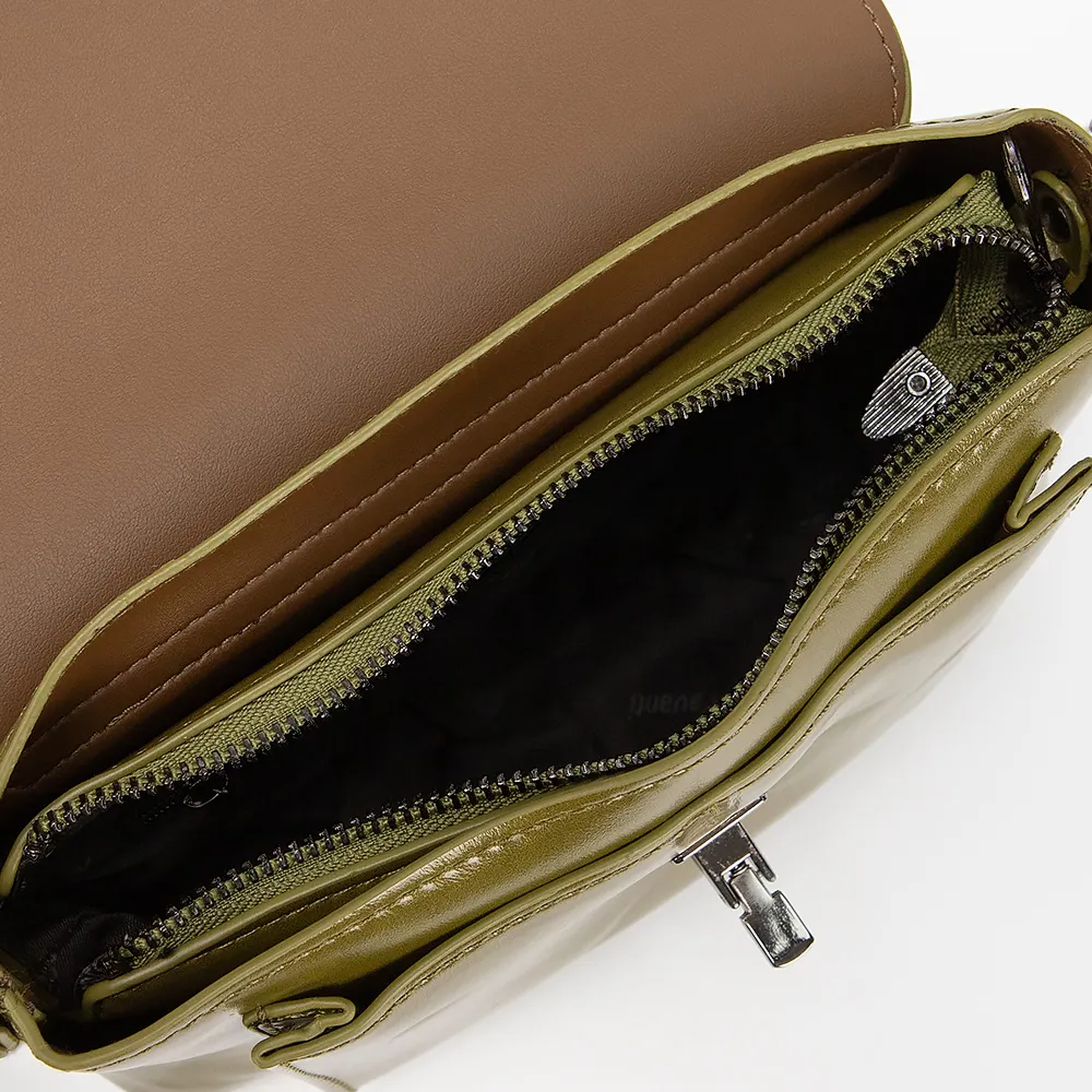 Сумка от торговой марки Passo Avanti из искусственной кожи цвета хаки. Модель со съемным регулируемым плечевым ремнем. Клапан на поворотном замке закрывает отделение на молнии и накладной карман. Внутри: текстильная подкладка, карман на молнии, накладной карман.