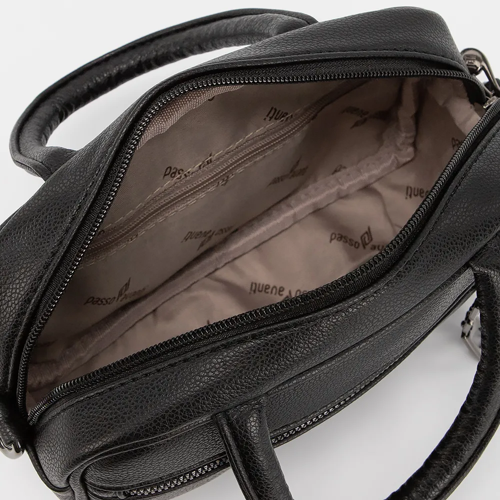Сумка от торговой марки Passo Avanti выполнена из искусственной кожи черного цвета. Модель с двумя ручками и съемным регулируемым плечевым ремнем. Отделение на молнии. Внутри: текстильная подкладка, карман на молнии, накладной карман. На лицевой стороне карман на молнии с пуллерами-подвесками. На задней стороне - карман на молнии.
