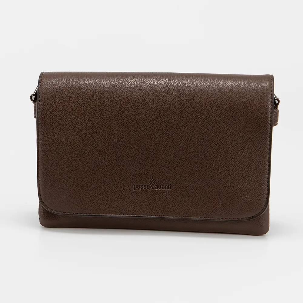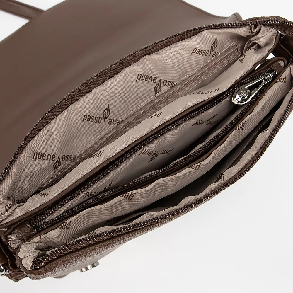 Сумка от торговой марки Passo Avanti выполнена из искусственной кожи коричневого цвета. Модель с длинным регулируемым плечевым ремнем. Клапан на магнитных кнопках закрывает отделение на молнии. Внутри: три отсека, средний - на молнии, текстильная подкладка, карман на молнии. На задней стороне - карман на молнии.