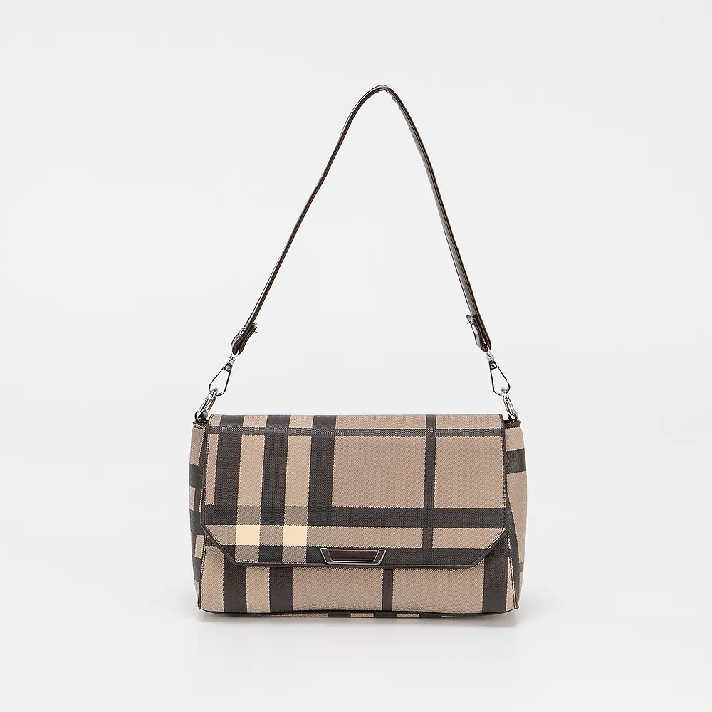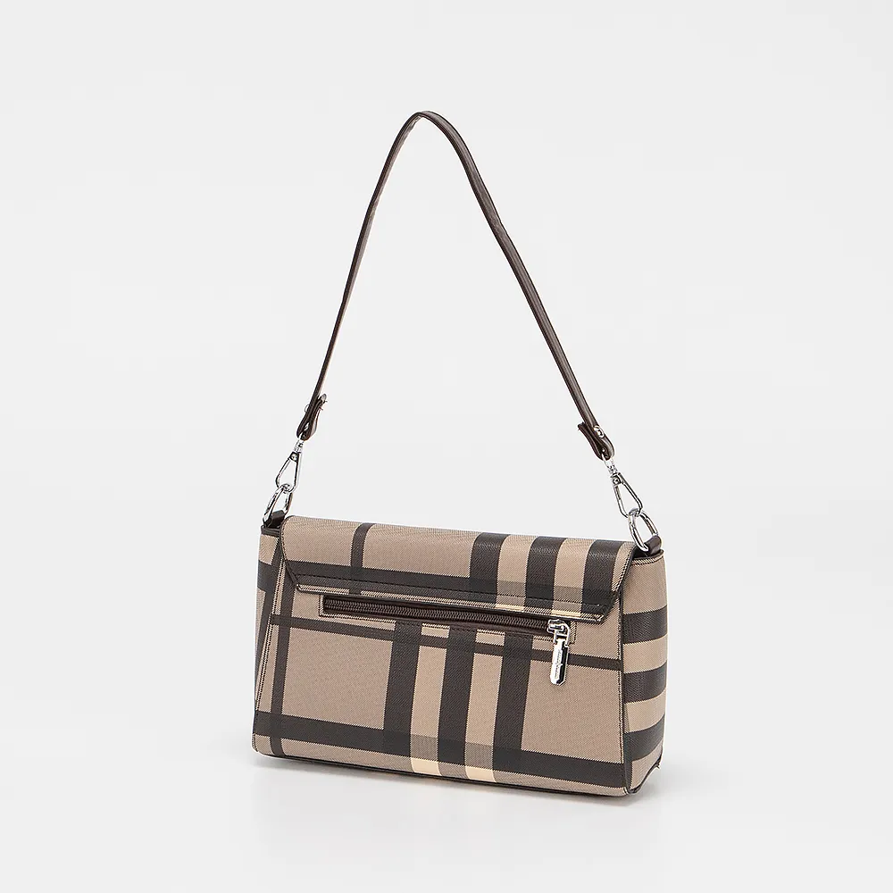 Сумка от торговой марки Passo Avanti выполнена из искусственной кожи кофейного цвета с коричневыми полосками. Модель с длинной ручкой и съемным регулируемым плечевым ремнем. Клапан на магнитных кнопках закрывает отделение на молнии. Внутри: текстильная подкладка, карман и средник на молнии, накладной карман. С задней стороны - карман на молнии.