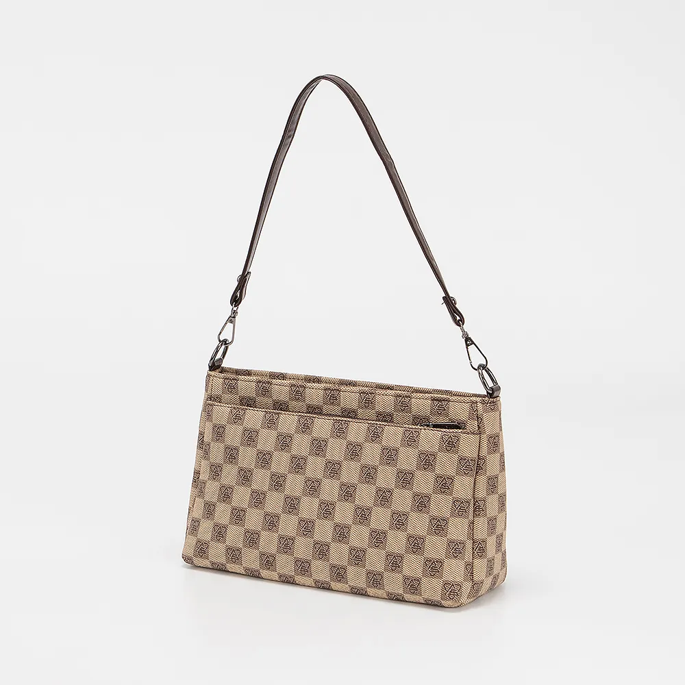 Сумка от торговой марки Passo Avanti из искусственной кожи бежевого цвета с принтом в клетку. Модель с длинной съемной ручкой. Отделение на молнии. Внутри: текстильная подкладка, карман на молнии, накладной карман. С лицевой и задней стороны - карман на молнии.