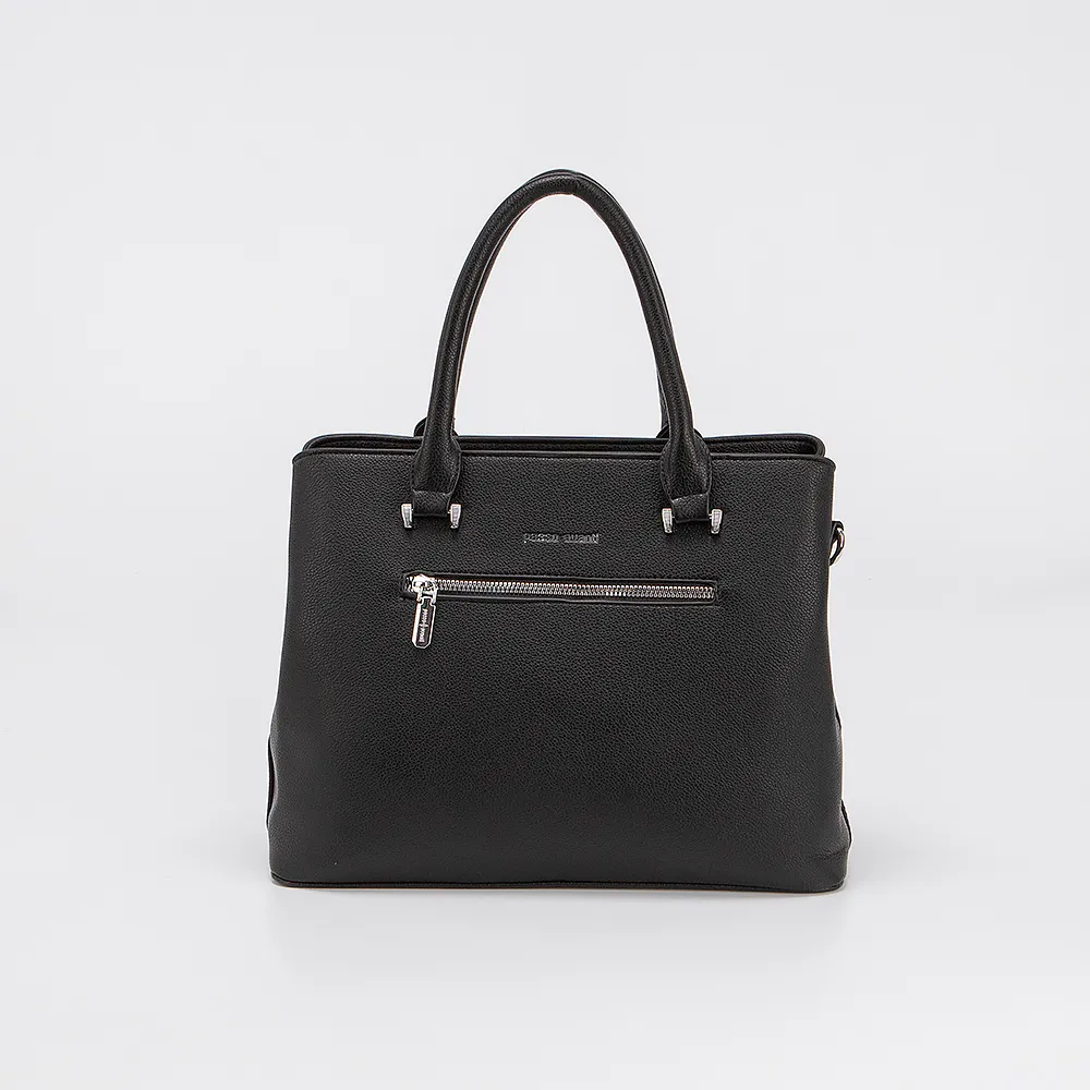 Сумка от торговой марки Passo Avanti выполнена из искусственной кожи черного цвета. Модель с двумя ручками и съемным регулируемым плечевым ремнем. Отделение на молнии. Внутри: текстильная подкладка, карман и средник на молнии, накладной карман. С лицевой и задней стороны - карман на молнии.