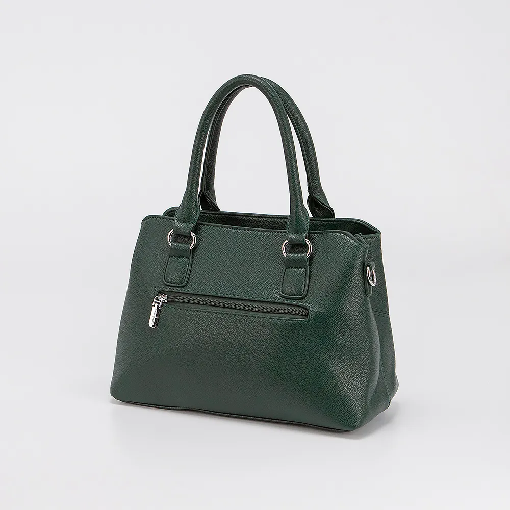 Сумка от торговой марки Passo Avanti выполнена из искусственной кожи зеленого цвета. Модель с двумя ручками и съемным регулируемым плечевым ремнем. Отделение на молнии. Внутри: текстильная подкладка, карман и средник на молнии, накладной карман. С задней стороны - карман на молнии.