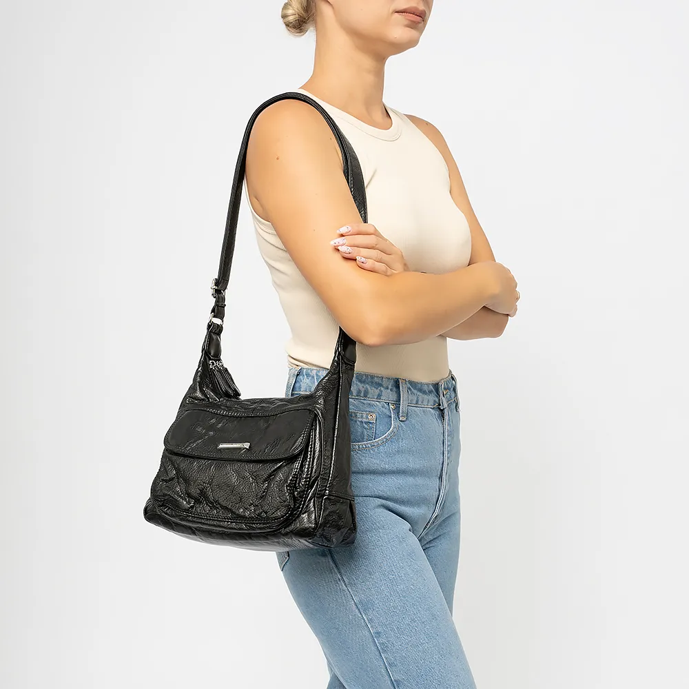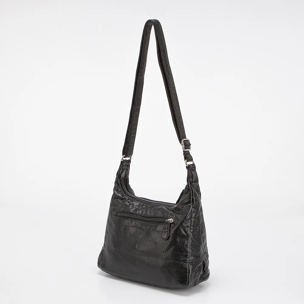 Сумка от торговой марки Passo Avanti выполнена из искусственной кожи черного цвета. Модель с длинным регулируемым плечевым ремнем. Два отделения на молнии. Внутри: текстильная подкладка. С лицевой стороны карман с клапаном.
