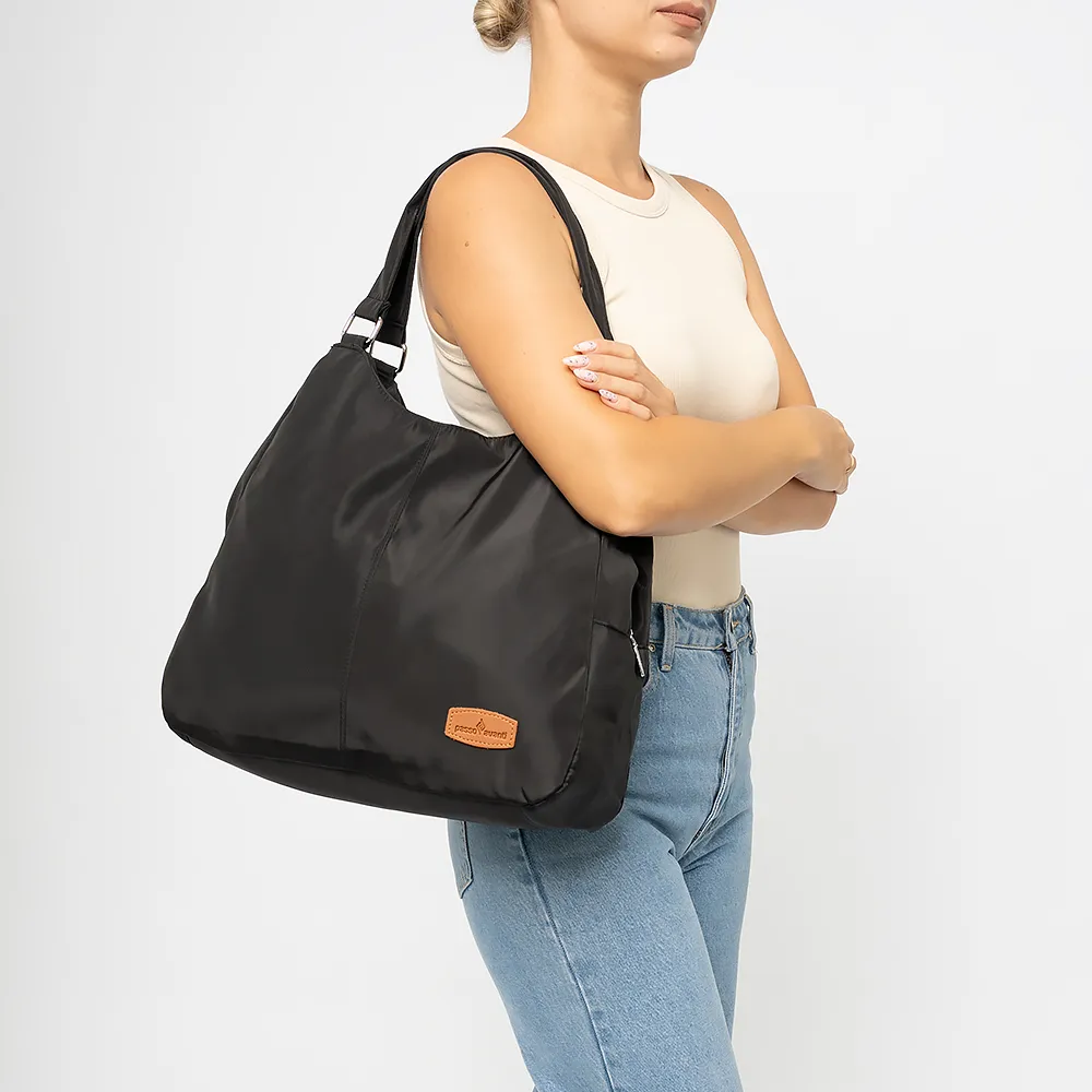 Сумка от торговой марки Passo Avanti выполнена из текстильного материала черного цвета. Модель с удлиненной ручкой. Два отделения на молнии. Внутри: текстильная подкладка, карман на молнии, накладной карман. На задней стороне - карман на молнии.