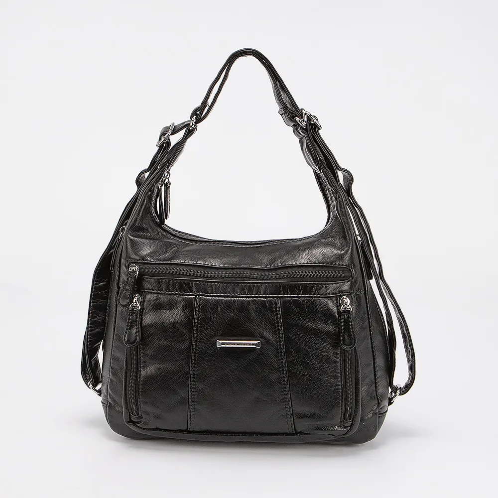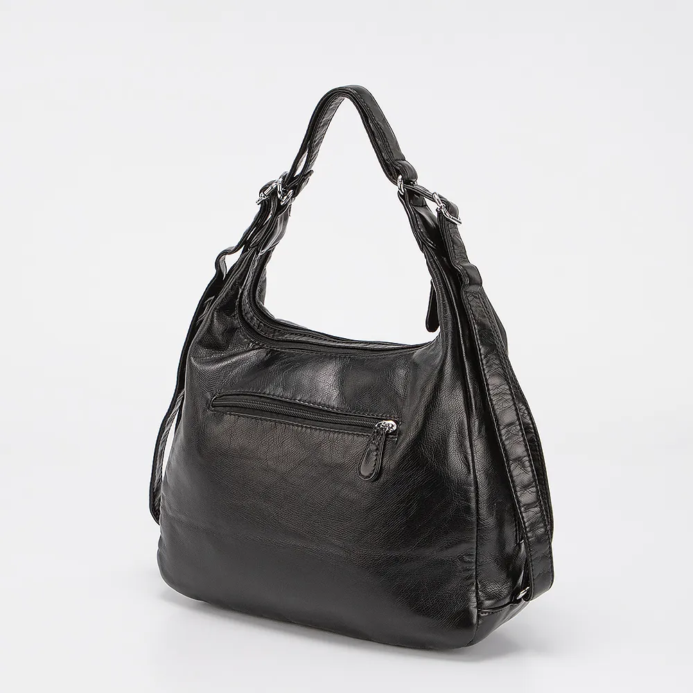 Сумка-рюкзак от торговой марки Passo Avanti выполнен из искусственной кожи черного цвета. Модель с удлиненной ручкой, которая стягивается в плечевые лямки. Два отделения на молнии. Внутри: текстильная подкладка. С лицевой стороны три кармана на молнии. По бокам - карманы на молнии.