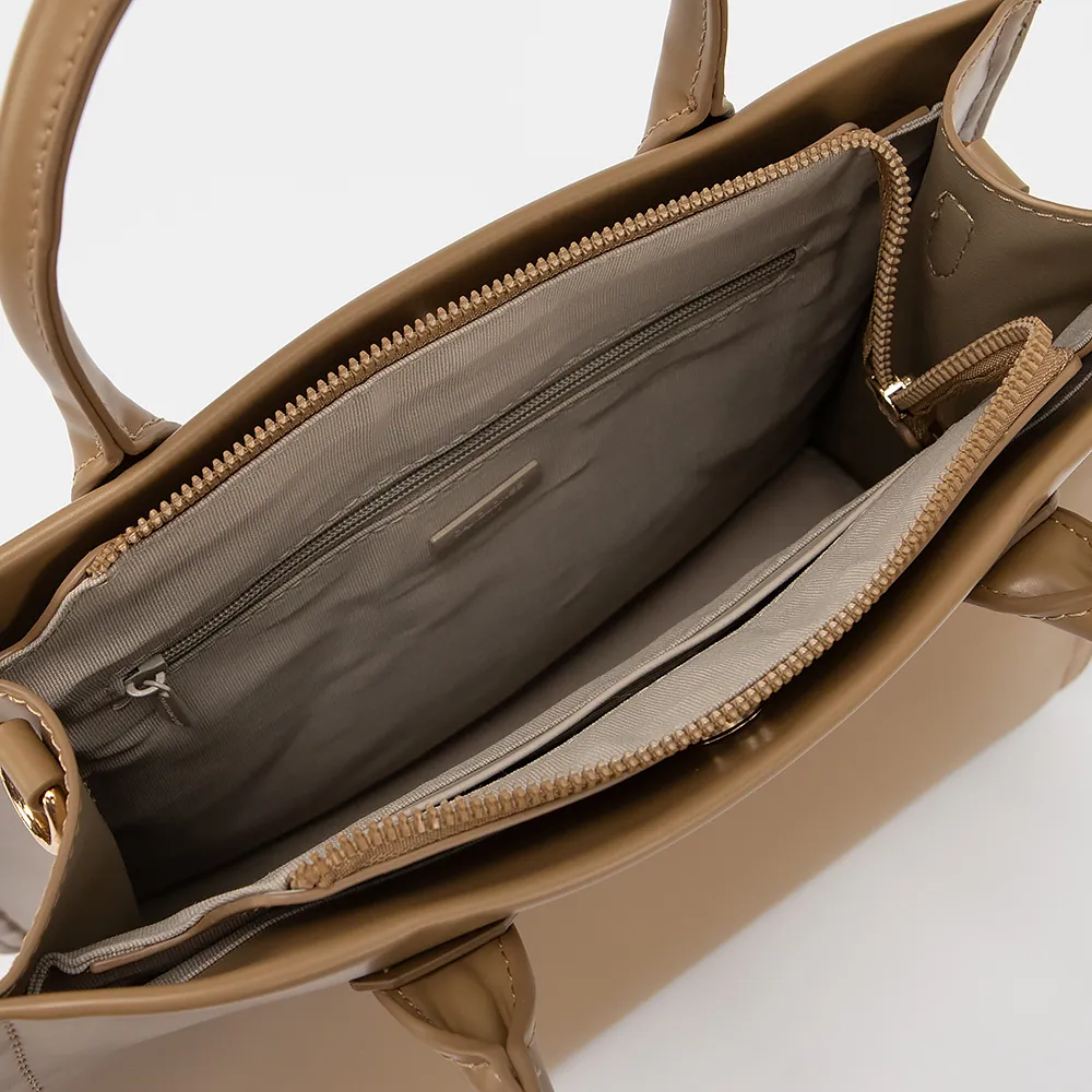 Сумка от торговой марки David Jones выполнена из искусственной кожи коричневого цвета. Модель с двумя ручками и съемным регулируемым плечевым ремнем. Три отделения: среднее - на молнии, боковые - на магнитной кнопке. Внутри: текстильная подкладка, карман на молнии, накладной карман.