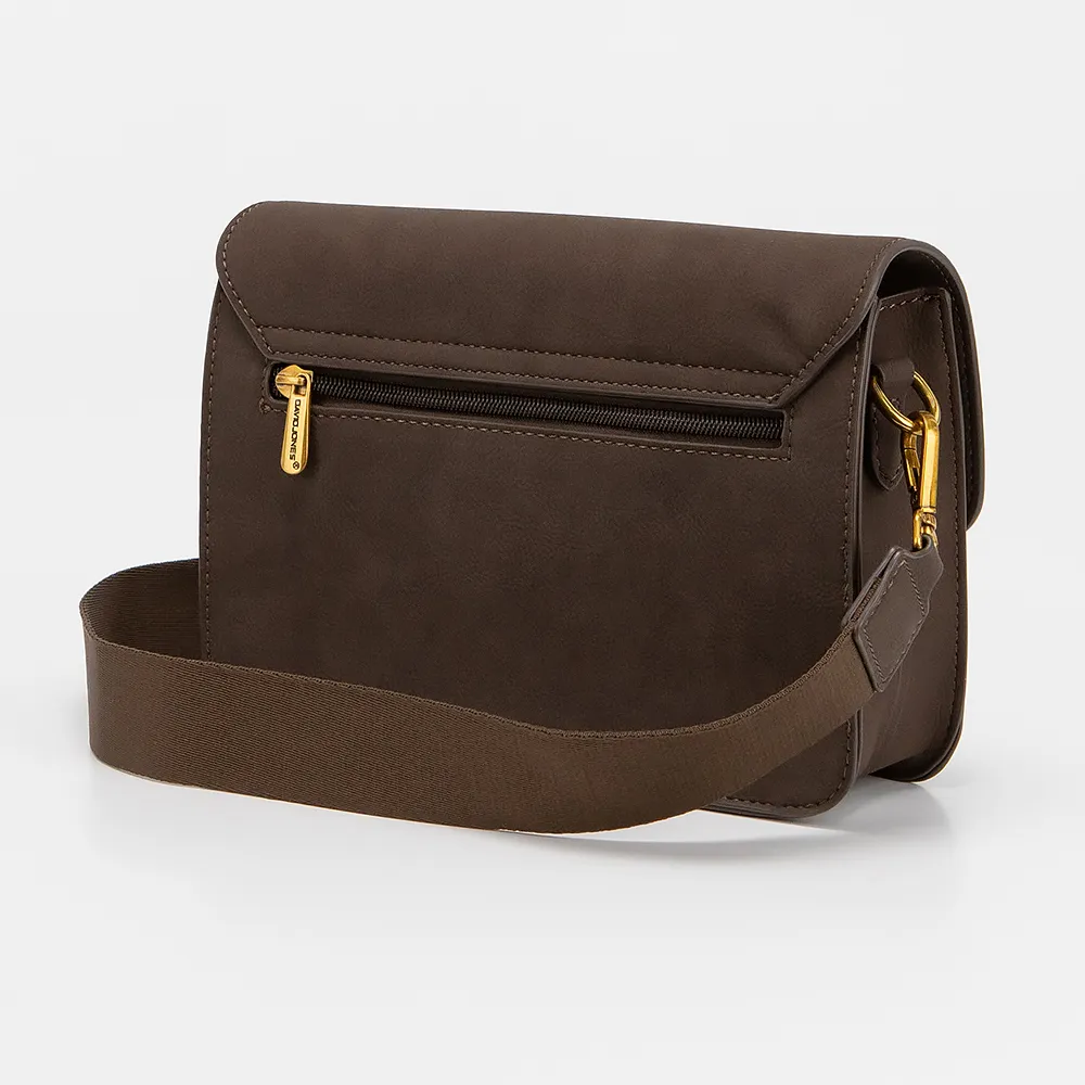 Сумка от торговой марки David Jones выполнена из искусственной кожи коричневого цвета. Модель с длинным регулируемым плечевым ремнем. Клапан на поворотном замке закрывает отделение на молнии и накладной карман на молнии. Внутри: текстильная подкладка, карман на молнии, накладной карман. На задней стороне - карман на молнии.