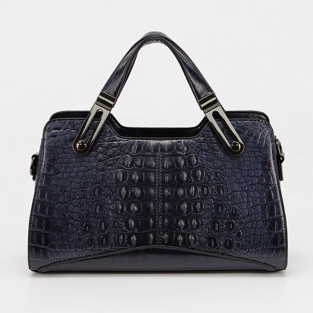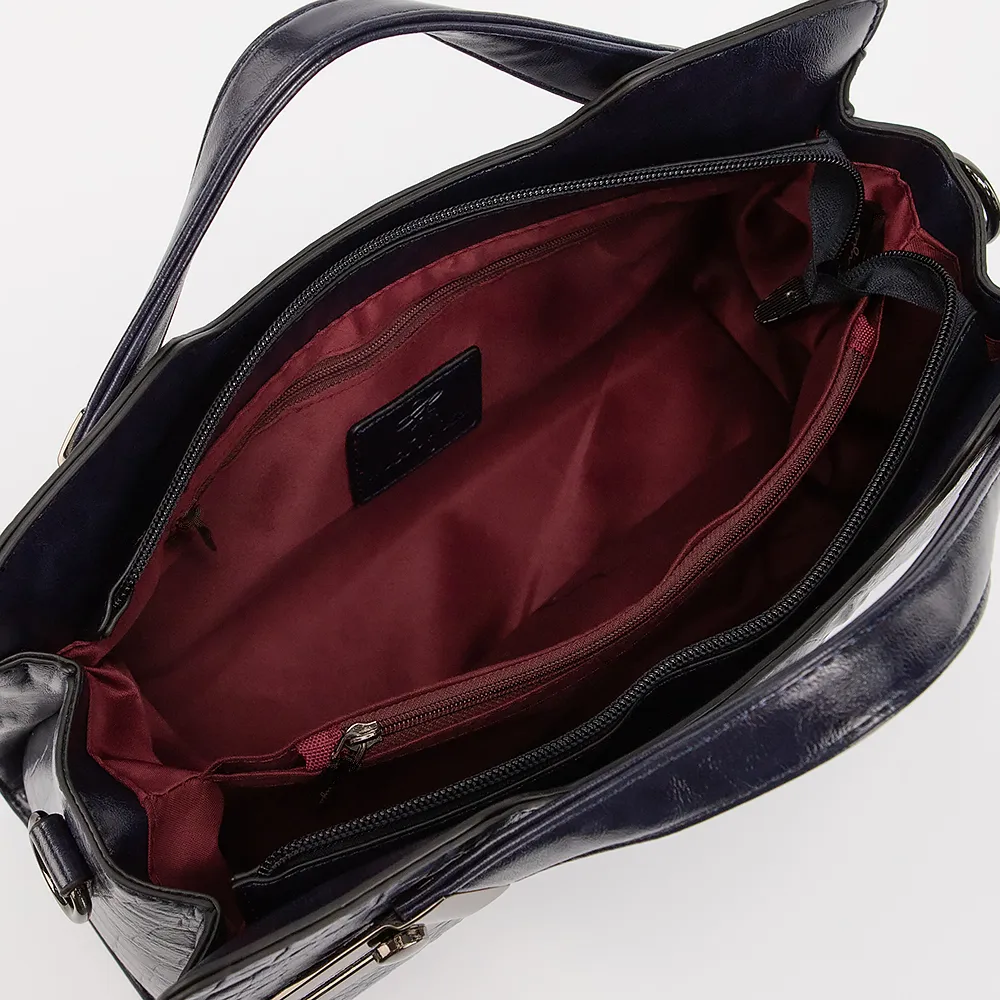 Сумка от торговой марки Marzia выполнена из искусственной кожи синего цвета с тиснением под рептилию. Модель с двумя ручками и съемным регулируемым плечевым ремнем. Отделение на молнии. Внутри: текстильная подкладка, карман и средник на молнии, накладной карман. На задней стороне - карман на молнии.
