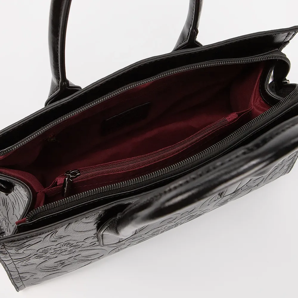 Сумка от торговой марки Marzia выполнена из искусственной кожи черного цвета с цветочным тиснением. Модель с двумя ручками и съемным регулируемым плечевым ремнем. Отделение на молнии. Внутри: текстильная подкладка, карман и средник на молнии, накладной карман. На задней стороне - карман на молнии.