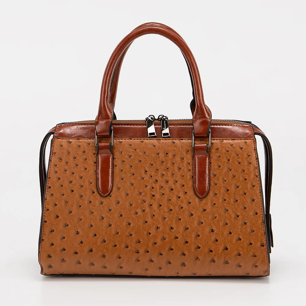 Сумка от торговой марки Marzia выполнена из искусственной кожи коричневого цвета с тиснением под страуса. Модель с двумя ручками и съемным регулируемым плечевым ремнем. Отделение на молнии. Внутри: текстильная подкладка, карман и средник на молнии, накладной карман.