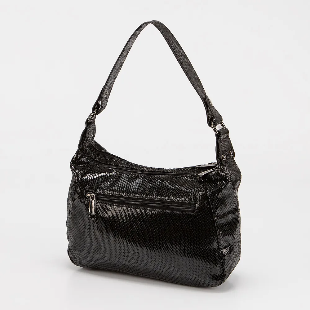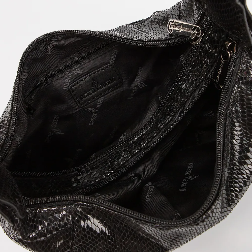 Сумка от торговой марки Passo Avanti выполнена из искусственной кожи черного цвета с лазерным тиснением. Модель с удлиненной ручкой. Два отделения на молнии. Внутри: фирменная текстильная подкладка, карман на молнии, накладной карман. На задней стороне - карман на молнии.