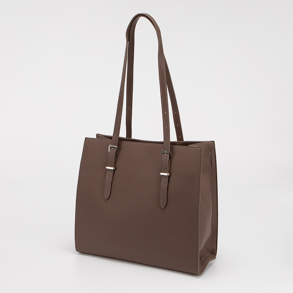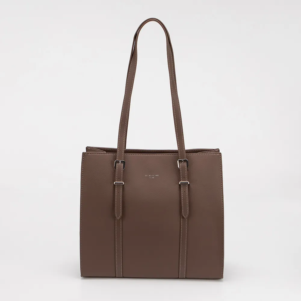Сумка от торговой марки David Jones выполнена из искусственной кожи коричневого цвета. Модель с двумя длинными регулируемыми ручками. Три отделения: среднее - на молнии, боковые - на магнитной кнопке, без подкладки. В среднем отделении внутри: текстильная подкладка, карман на молнии, накладной карман.
