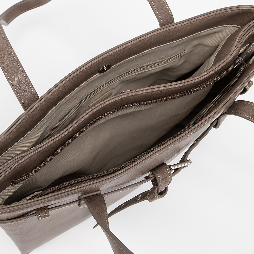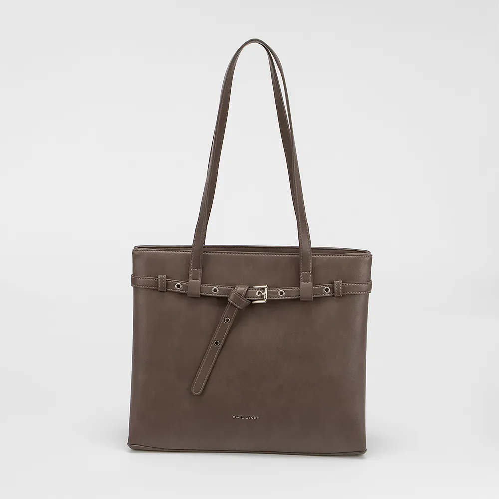 Сумка от торговой марки David Jones выполнена из искусственной кожи кофейного цвета. Модель с двумя длинными ручками. Декорирована тонкими ремешками. Два отделения: одно - на молнии, второе - на магнитной кнопке. Внутри: текстильная подкладка, карман на молнии, накладной карман. На задней стороне - карман на молнии.