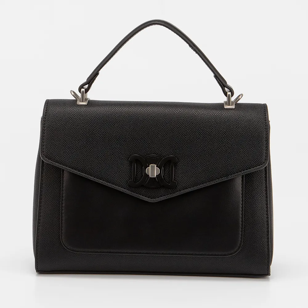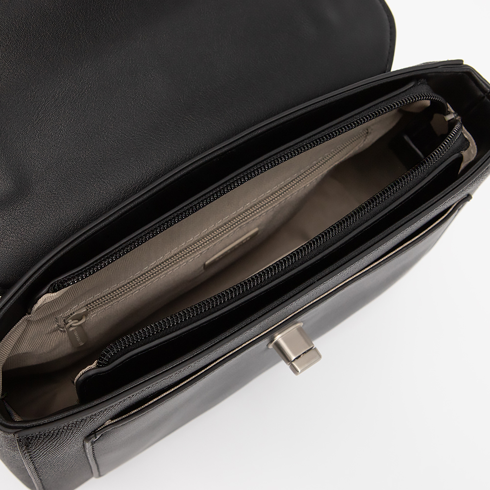 Сумка от торговой марки David Jones выполнена из искусственной кожи черного цвета. Модель с ручкой и длинным регулируемым плечевым ремнем. Клапан на поворотном замке закрывает накладной карман и отделение на молнии. Внутри: текстильная подкладка, карман на молнии, накладной карман. На задней стороне - карман на молнии.