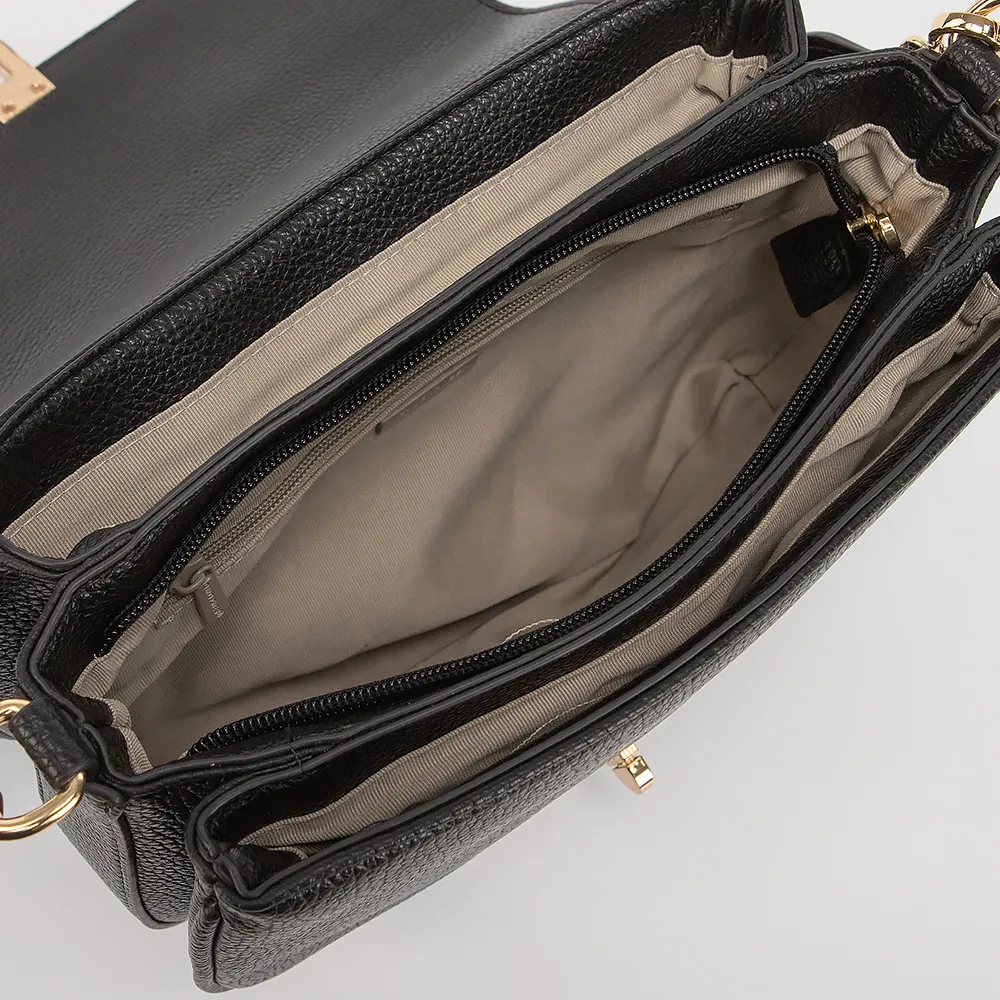 Сумка от торговой марки David Jones выполнена из искусственной кожи черного цвета. Модель с удлиненной ручкой и съемным регулируемым широким плечевым ремнем из текстильного материала. Клапан на поворотном замке закрывает три отделения: среднее - на молнии, боковые - без застежки. Внутри: текстильная подкладка, карман на молнии, накладной карман. На задней стороне - карман на молнии.