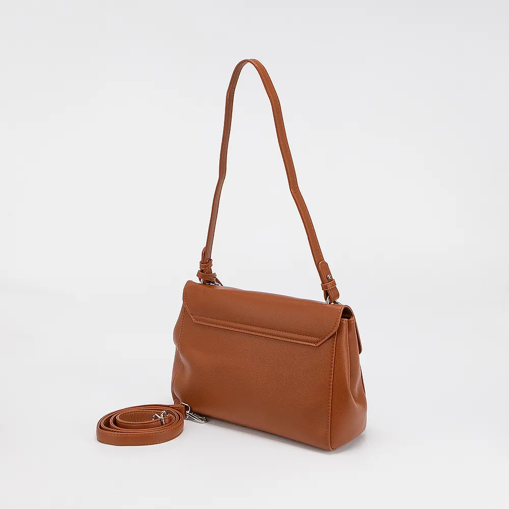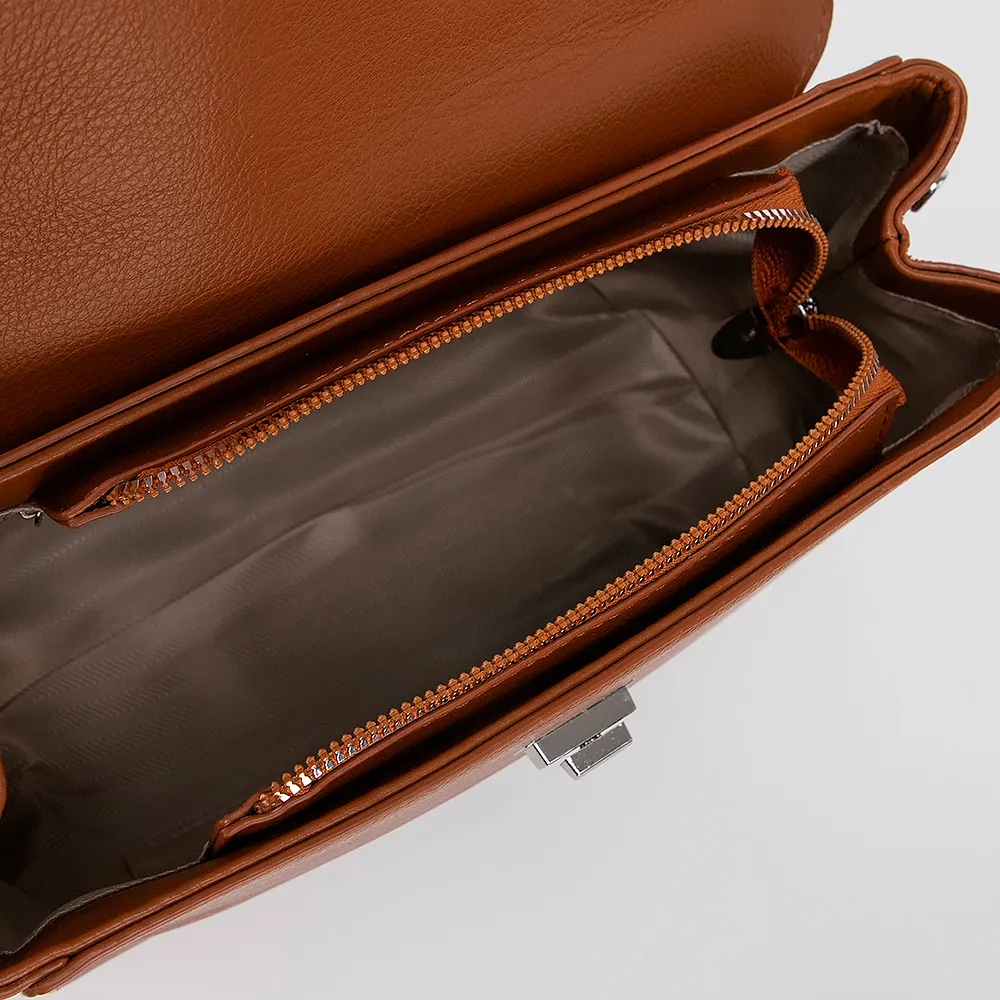 Сумка от торговой марки Valigetti выполнена из искусственной кожи коричневого цвета. Модель с коротким и длинным регулируемым плечевым ремнем. Декорирована цепочкой и подвеской. Клапан на поворотном замке закрывает отделение на молнии. Внутри: текстильная подкладка, карман на молнии, накладной карман.