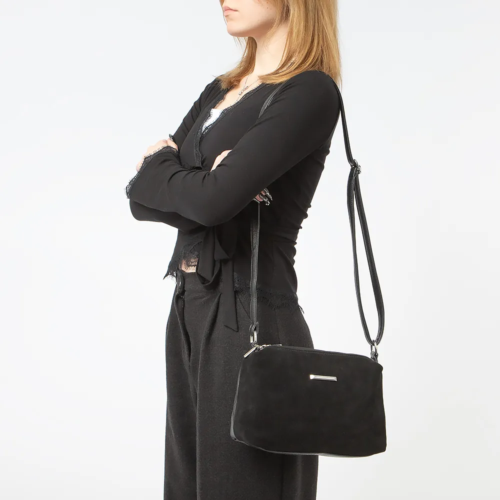 Сумка от торговой марки Passo Avanti выполнена из искусственной замши и искусственной кожи черного цвета. Модель с несъемным регулируемым плечевым ремнем. Три отделения на молнии. Внутри: текстильная подкладка, карман на молнии, накладной карман. На задней стороне - карман на молнии.