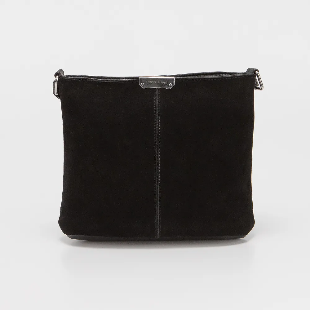 Сумка от торговой марки Passo Avanti из искусственной замши и искусственной кожи черного цвета. Модель с несъемным регулируемым плечевым ремнем. Отделение на молнии. Внутри: текстильная подкладка, карман и средник на молнии, накладной карман. На задней стороне - карман на молнии.