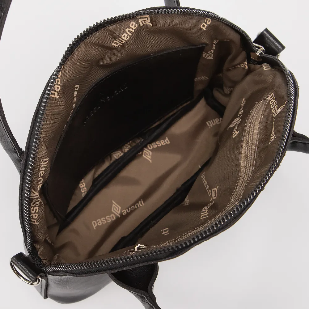 Сумка от торговой марки Passo Avanti выполнена из искусственной кожи черного цвета. Модель с двумя ручками и длинным регулируемым плечевым ремнем. Отделение на молнии. Внутри: текстильная подкладка, карман на молнии, накладной карман. На лицевой стороне - два накладных кармана.
