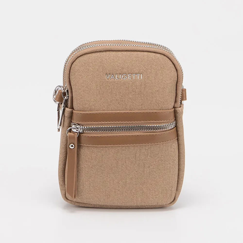 Сумка от торговой марки Valigetti выполнена из искусственной кожи бежевого цвета. Модель вертикальной ориентации с широким съемным плечевым ремнем. Три отделения на молнии. Внутри: текстильная подкладка. С лицевой стороны - карман на молнии.