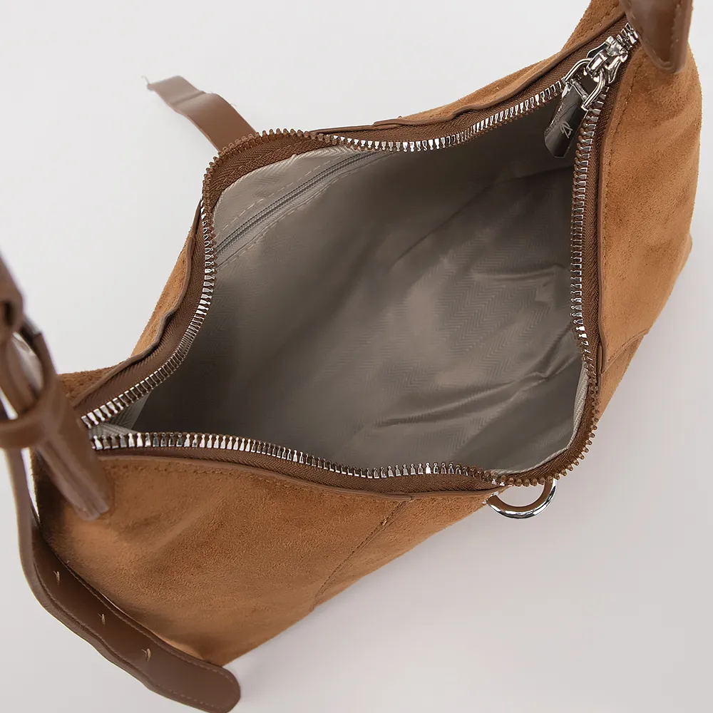 Сумка от торговой марки Valigetti выполнена из искусственной кожи и искусственной замши. Модель с несъемным регулируемым плечевым ремнем. Отделение на молнии, дополнительно фиксируется хлястиком. Внутри: текстильная подкладка, карман на молнии, накладной карман.